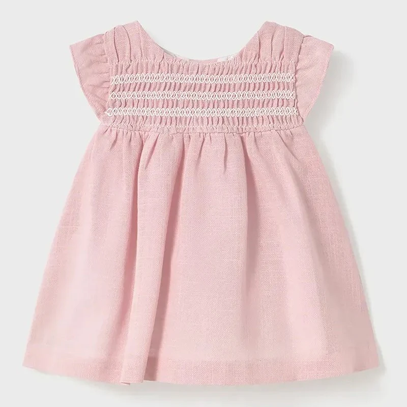 Abito MAYORAL in cotone, modello svasato, girocollo con manic a a sbuffo ,corpetto lavorato a nido d’ape , chiusura sul retro con bottoncini.