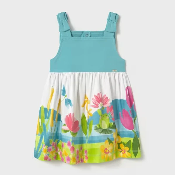Abito MAYORAL in cotone a fantasia con fiocchi sulle spalline , chiusura con clips sul retro.