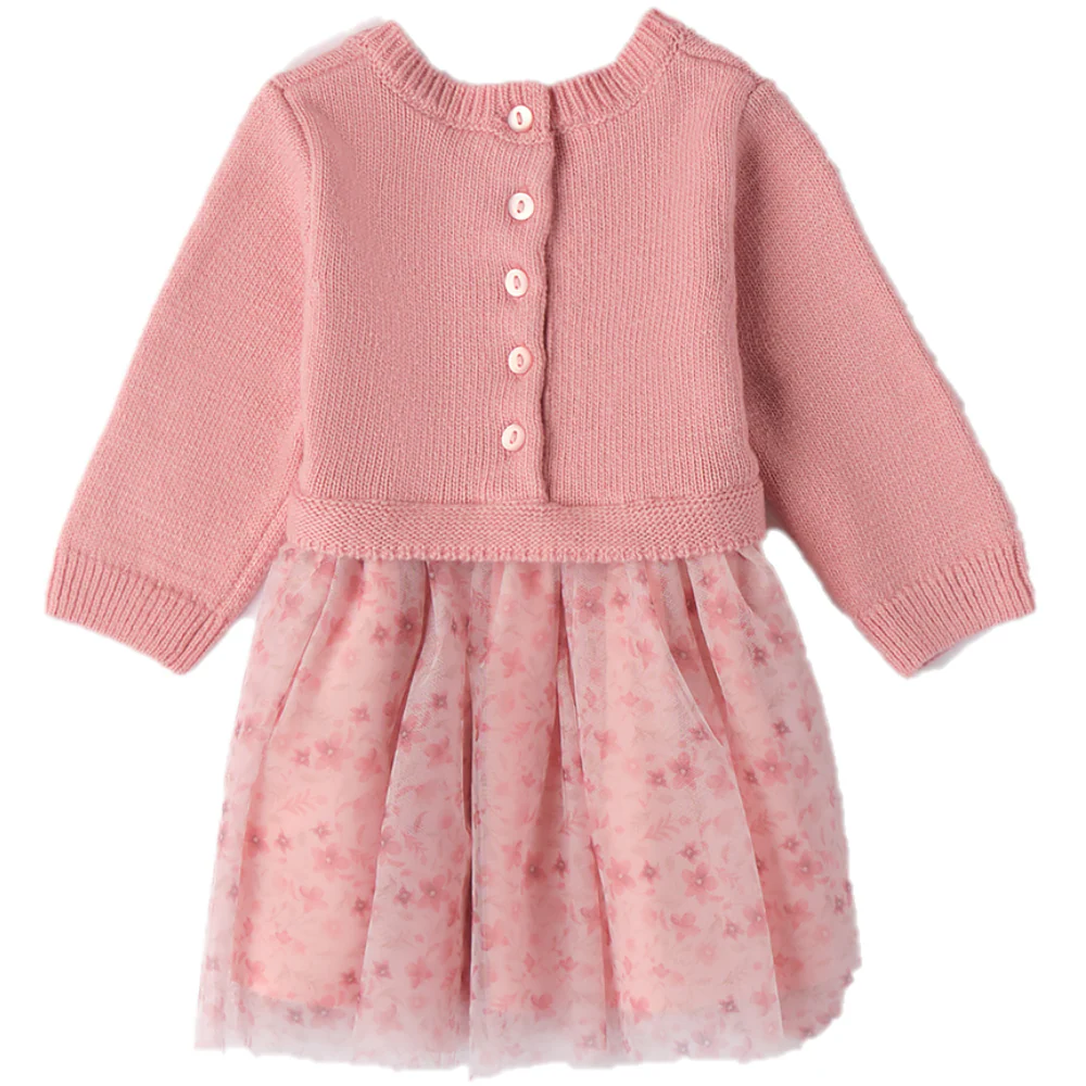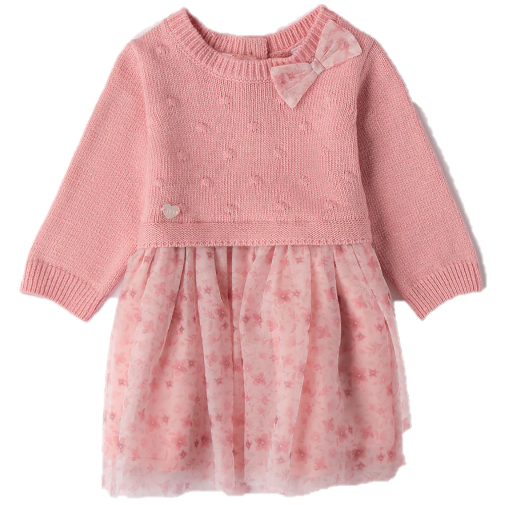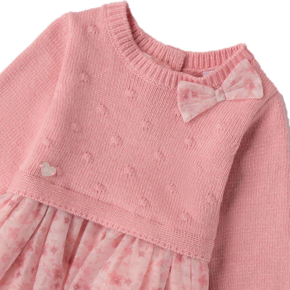 Abito MINIBANDA con parte superiore in maglia e parte inferiore in tulle a fantasia con fiocco applicato, apertura sul retro.