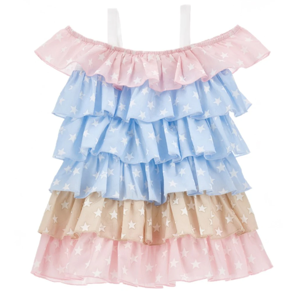 Abito MONNALISA in cotone con bretelline e balze multicolor a fantasia stelle applicata modello prendisole con logo cuoricino applicato bordo superiore elastico.
