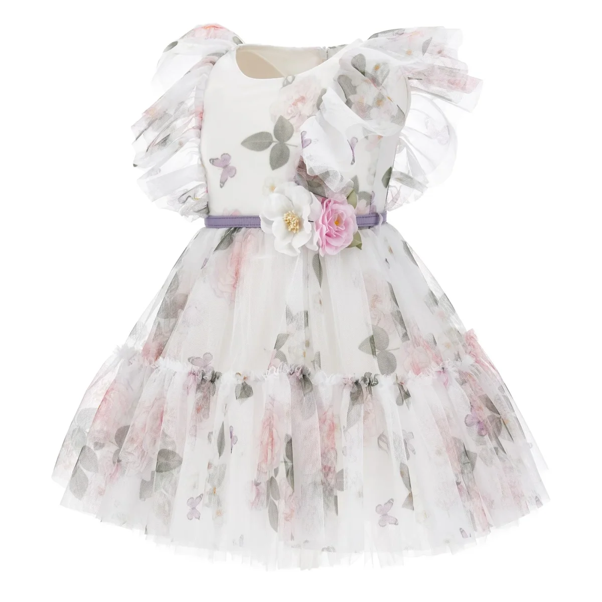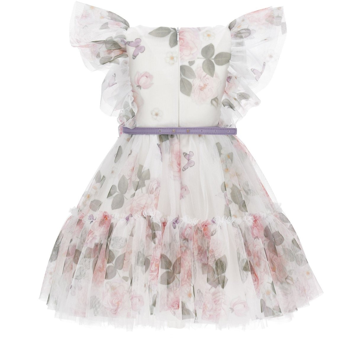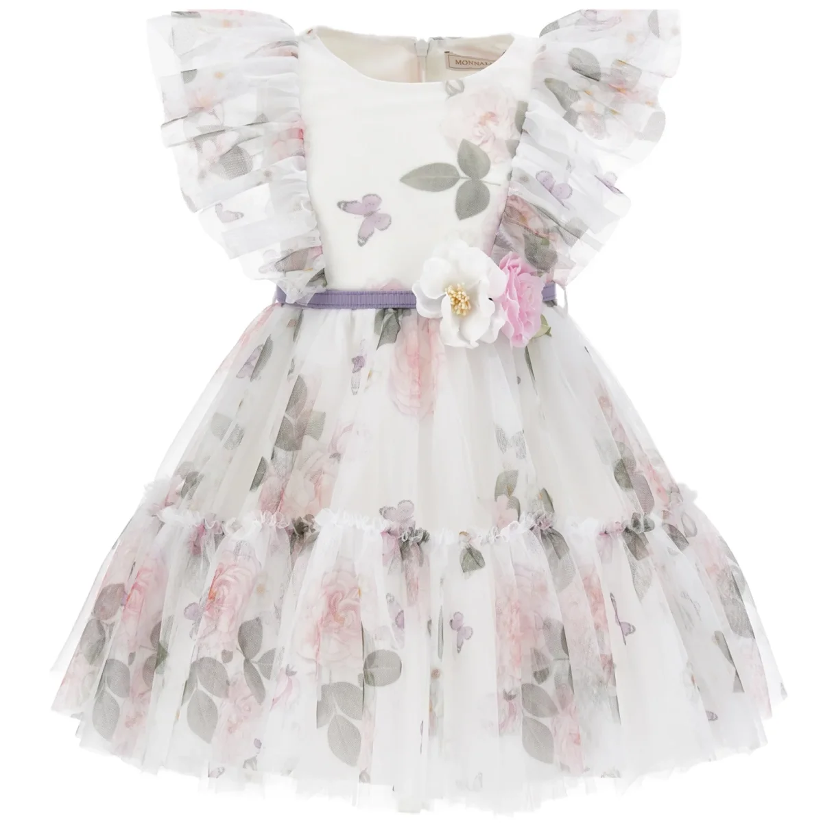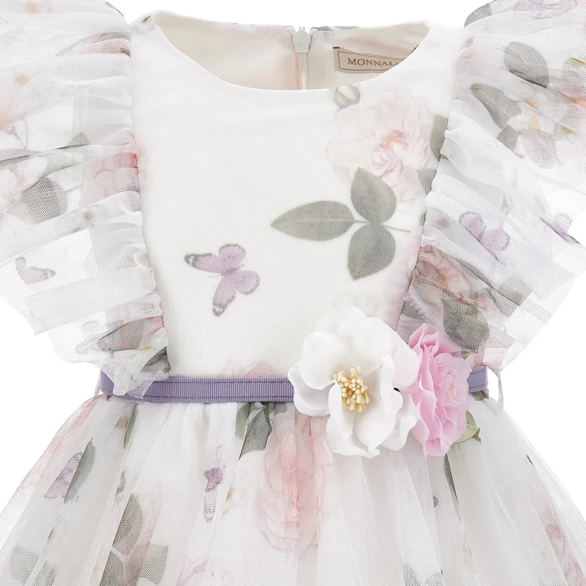 Abito MONNALISA in tulle a fantasia, dotato di cintura in vita con applicazione, sottoabito in cotone. apertura con zip a scomparsa sul retro.