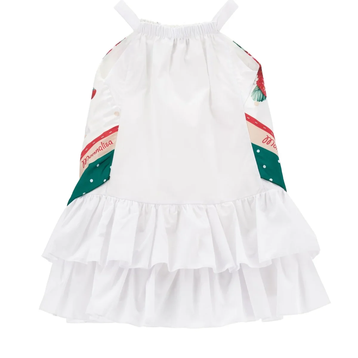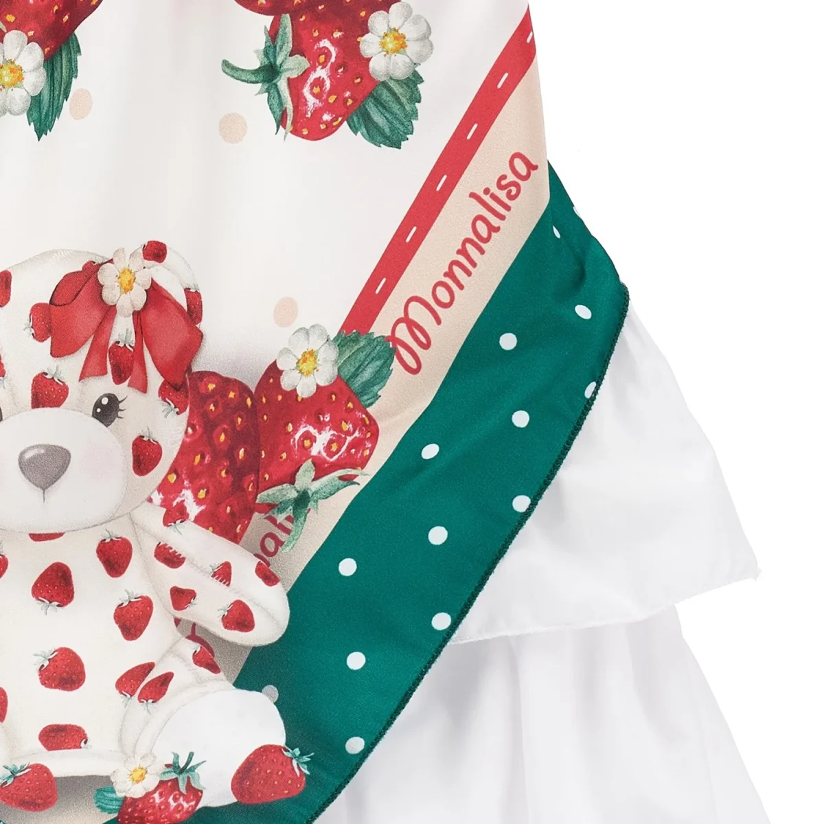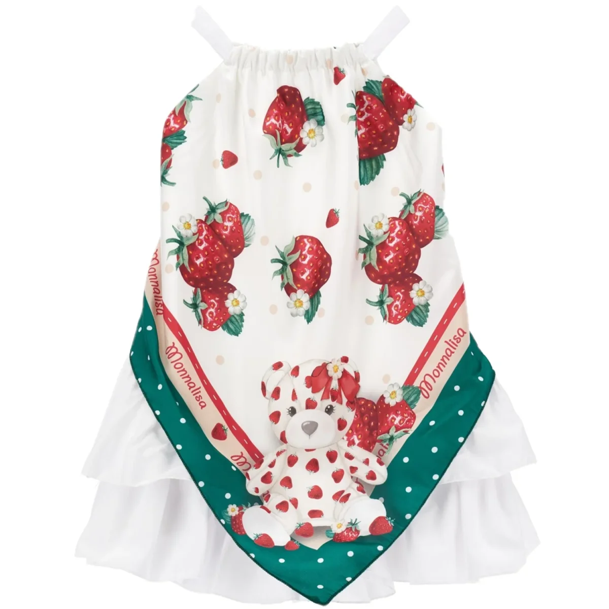 Abito MONNALISA modello foulard a fantasia con orsetto e fragole. Abito dotato di una vestibilità straordinaria. multi balze sul retro.