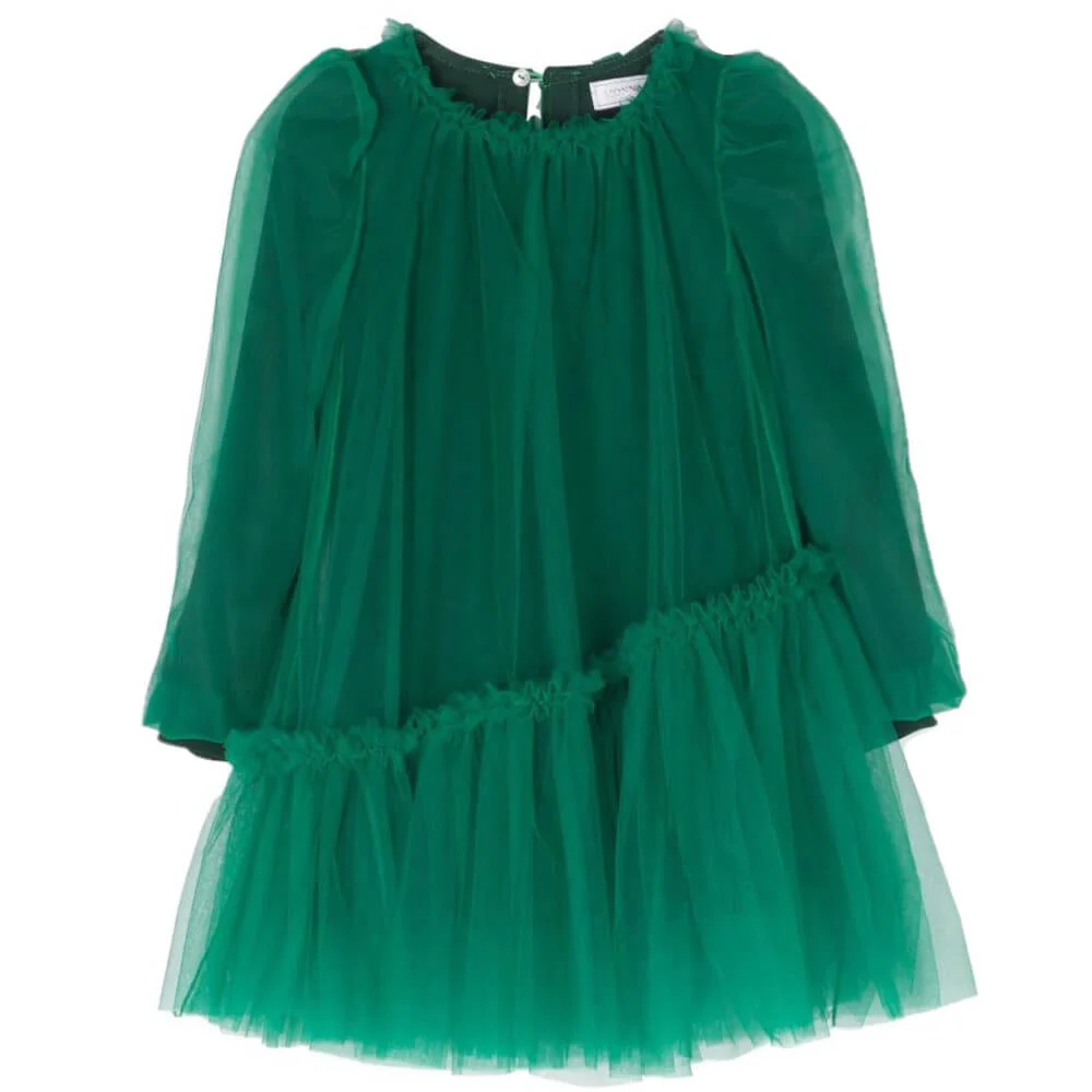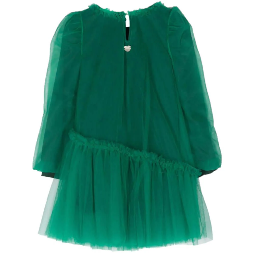 Abito MONNALISA modello asimettrico in tulle a manica lunga con chiusura bottoncino sul retro rifinitura con rouches foderato in cotone invernale.