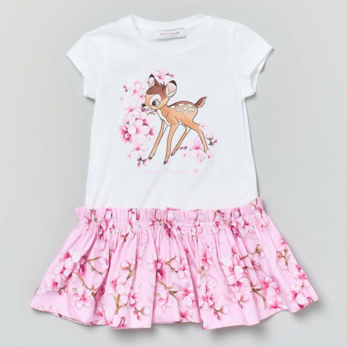 Abito Monnalisa in cotone modello girocollo mezza manica con stampa a fantasia BAMBI, rifiniture nei minimi dettagli.