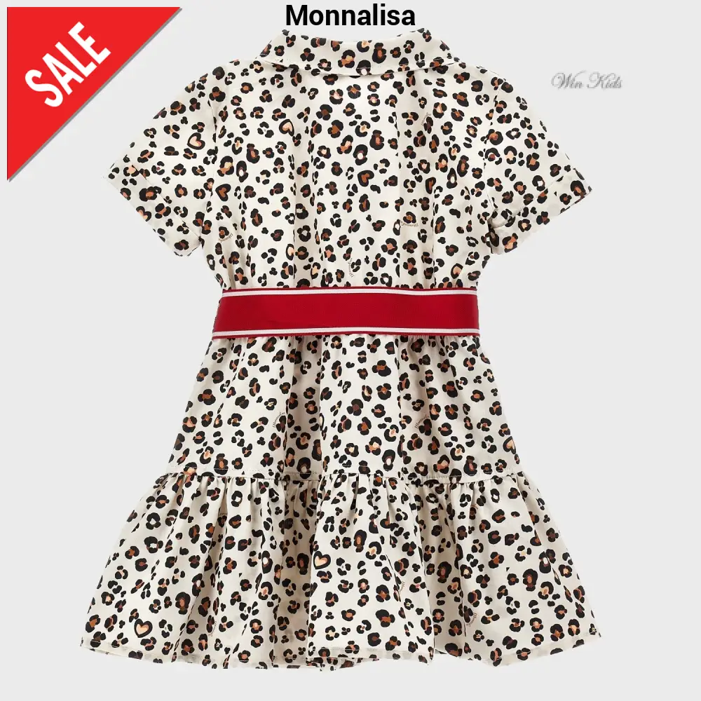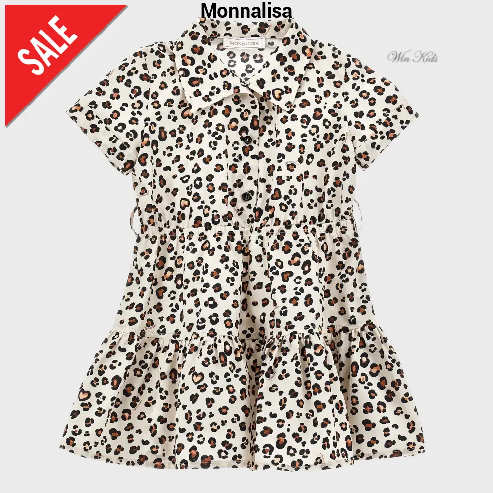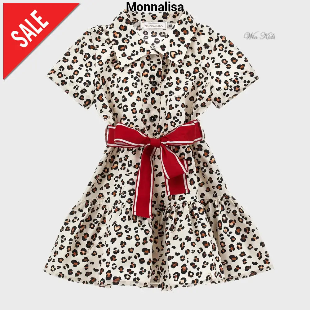 Abito MONNALISA in cotone modello chemisier maculato a manica corta e colletto applicato , chiusura corta mediante bottoncini , vita elastica con cintura in coordinato sia regolabile che removibile , parte inferiore con gonna effetto svasato .