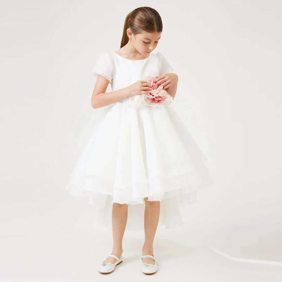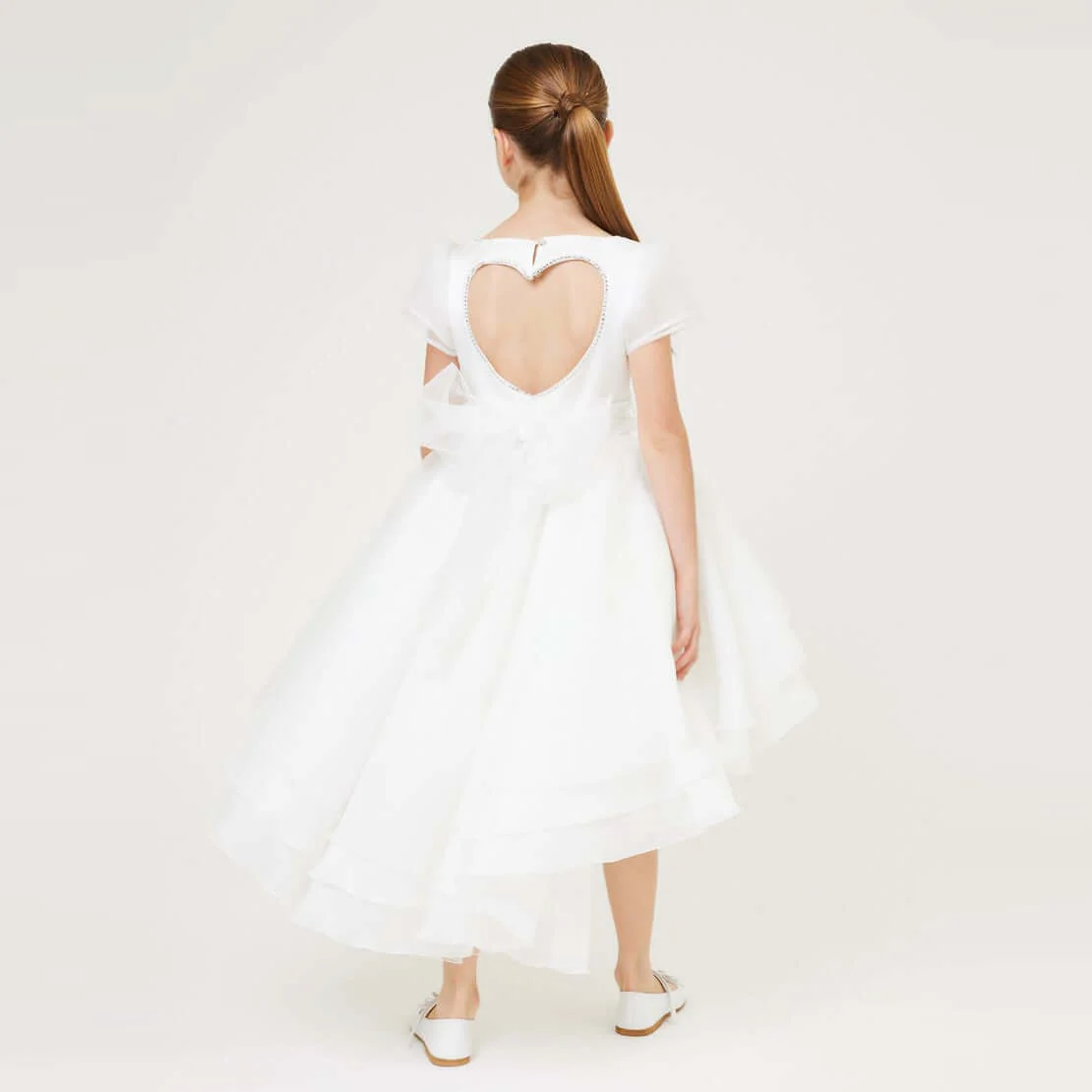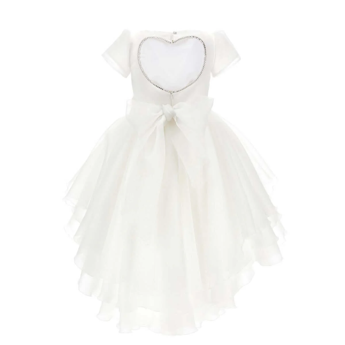 Abito Monnalisa Lavinia scenografico e sofisticato, con un effetto glam enfatizzato dal lurex, Lavinia abito di alta gamma Monnalisa Couture, è incluso nel progetto di filiera registrata Blockchain, per certificare e garantire al consumatore altissima qualità, sostenibilità e protezione del Made in Italy e dei prodotti del lusso realizzati con la sapienza del fare del nostro Paese.” Rasone e tessuto glitterato fine. Cintura a nastro con scenografica broche floreale . Cut out a forma di cuore con profilo strass sul retro. Fodera in mussola e tulle.