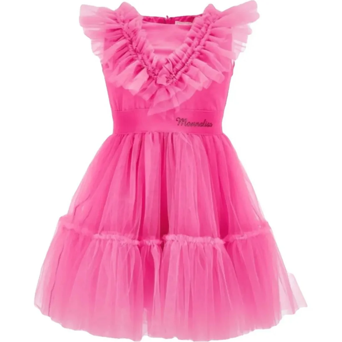 Abito MONNALISA in morbido tulle con sottoabito in cotone elastico in vita con logo in strass.