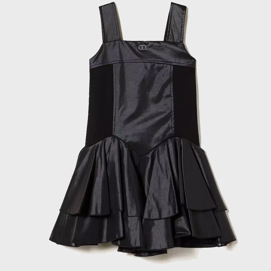 Abito TWINSET in ecopelle e tessuto elastico a contrasto , chiusura zip laterale a scomparsa , logo in metallo a rilievo ,gonna a balze con fodera in cotone .