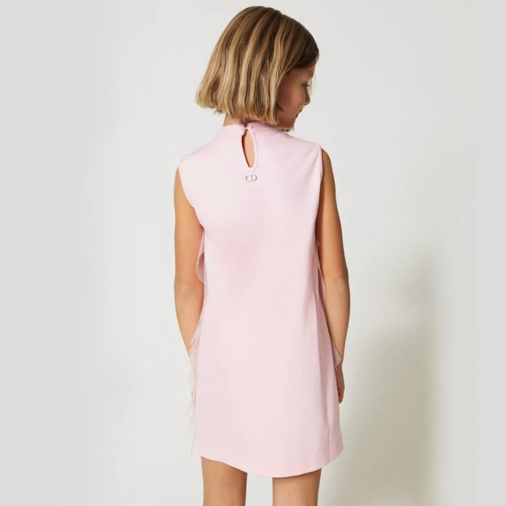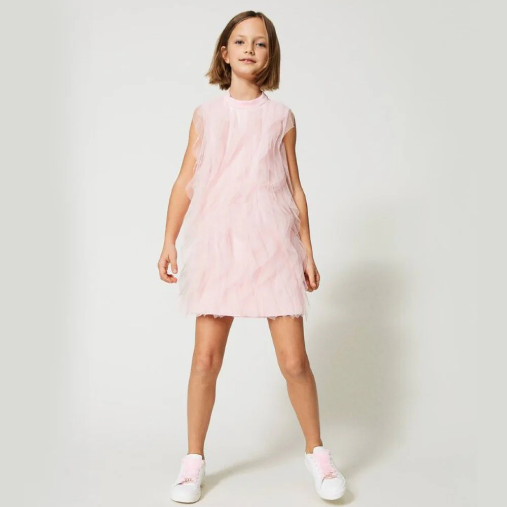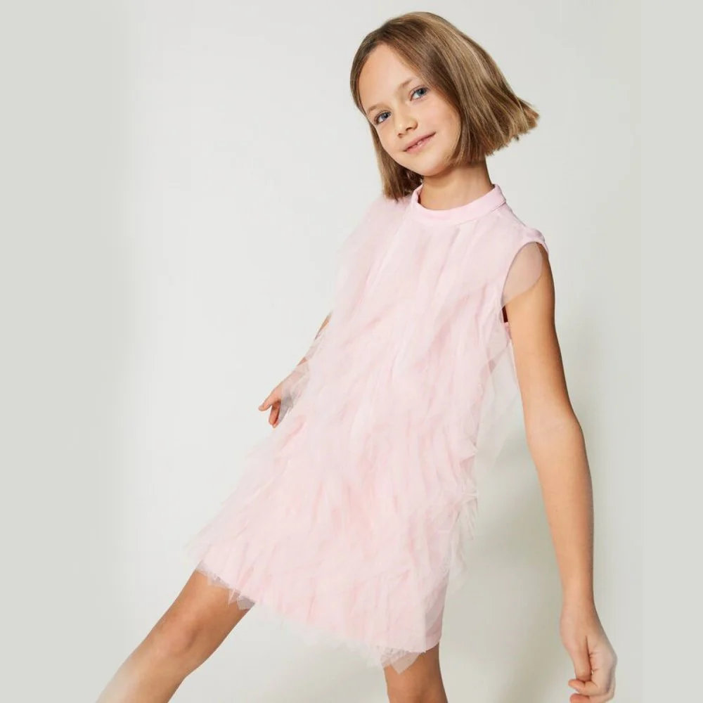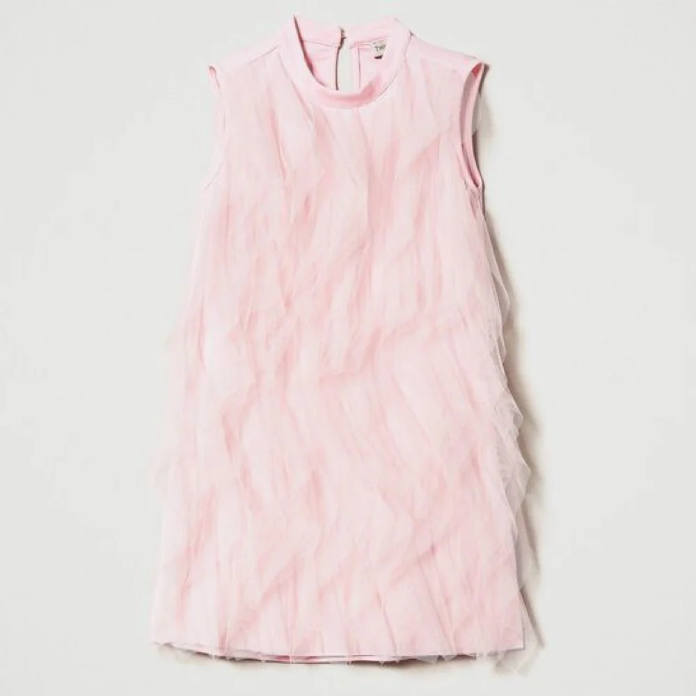 Abito TWINSET in tulle con balze anteriormente chiusura con bottoncino sul retro e logo applicato.