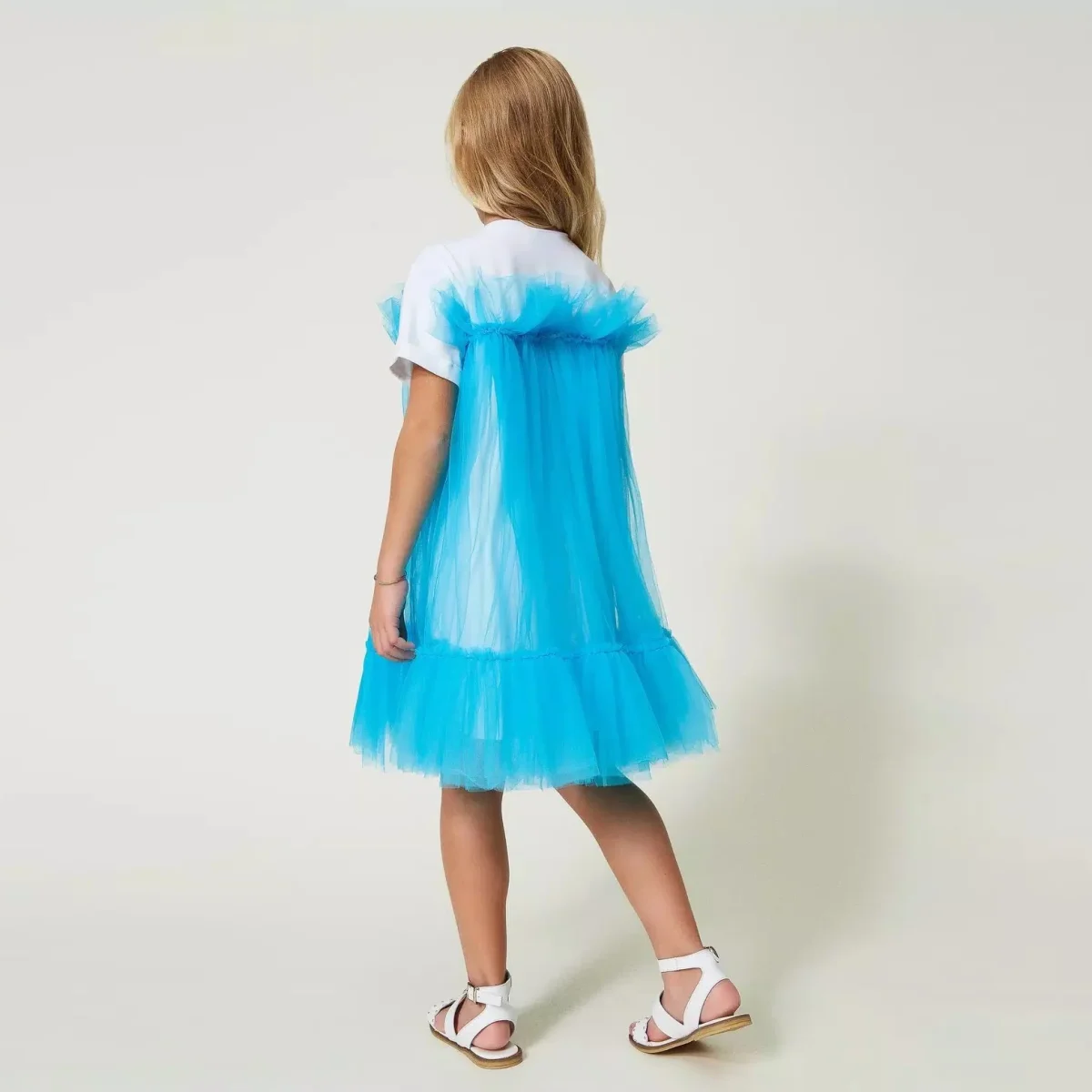Abito TWINSET modello corto linea svasata , effetto trompe l’oeil con parte superiore a t-shirt in cotone e tulle con balze e volant arricciato.