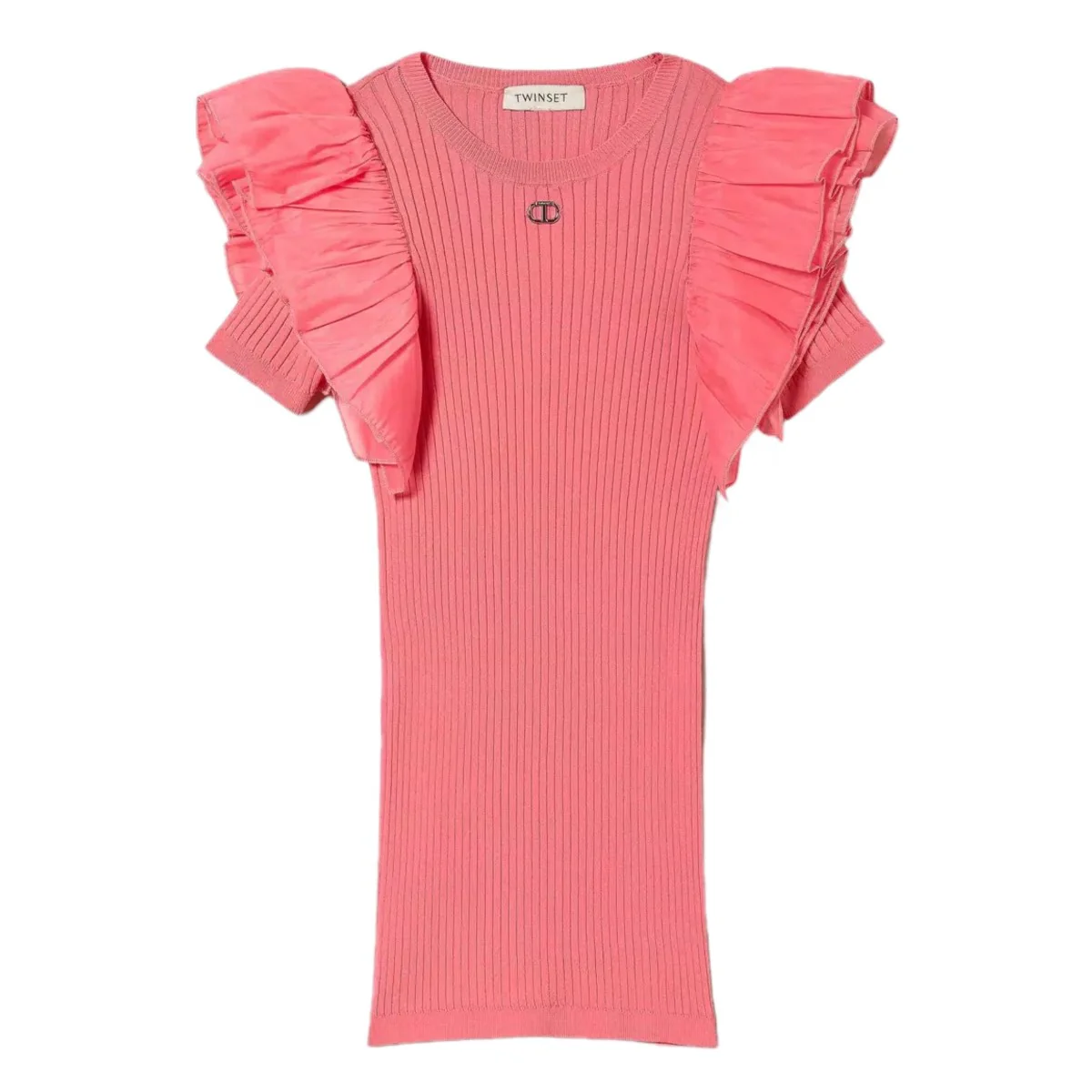 Abito TWINSET linea fitted in misto viscosa con logo in metallo davanti, maniche corte con balze in organza, collo tondo.