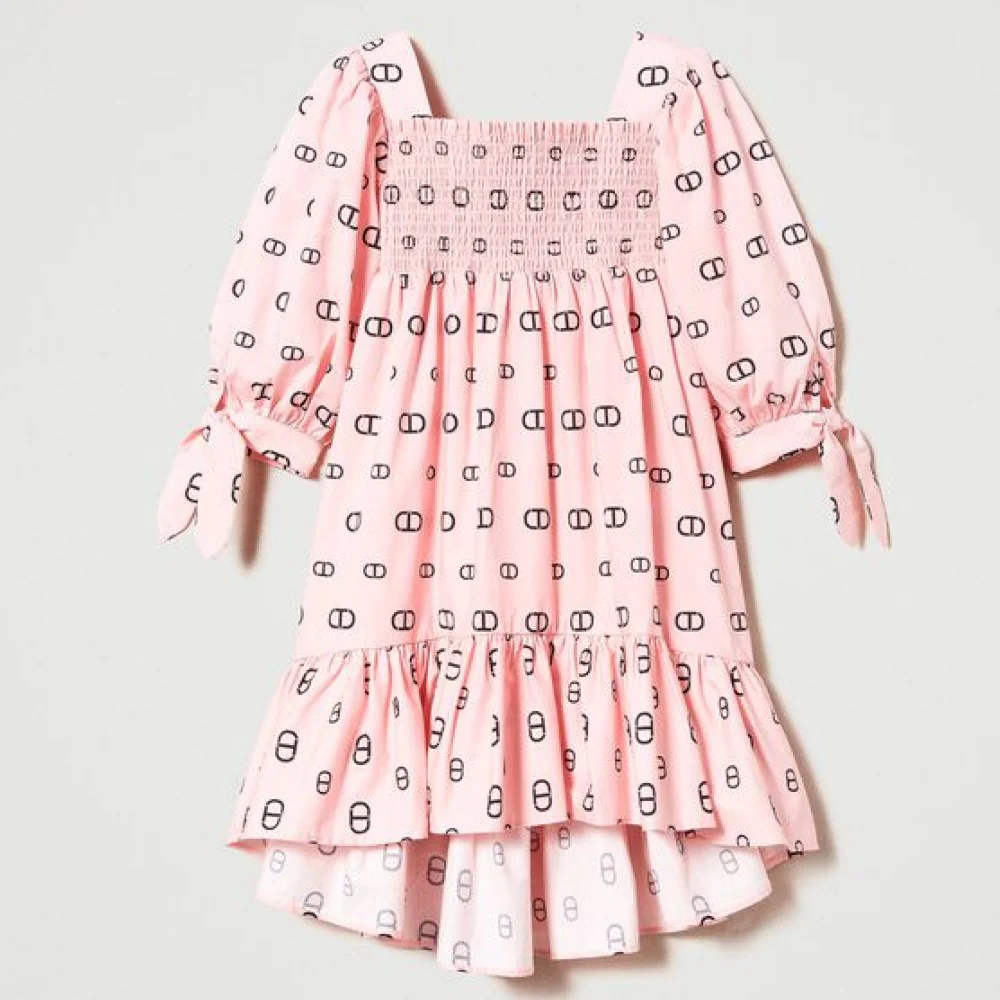 Abito TWINSET in cotone con loghi stampati a contrasto balza arricciata al fondo maniche con fioccocorpetto elastico con logo in metallo applicato.