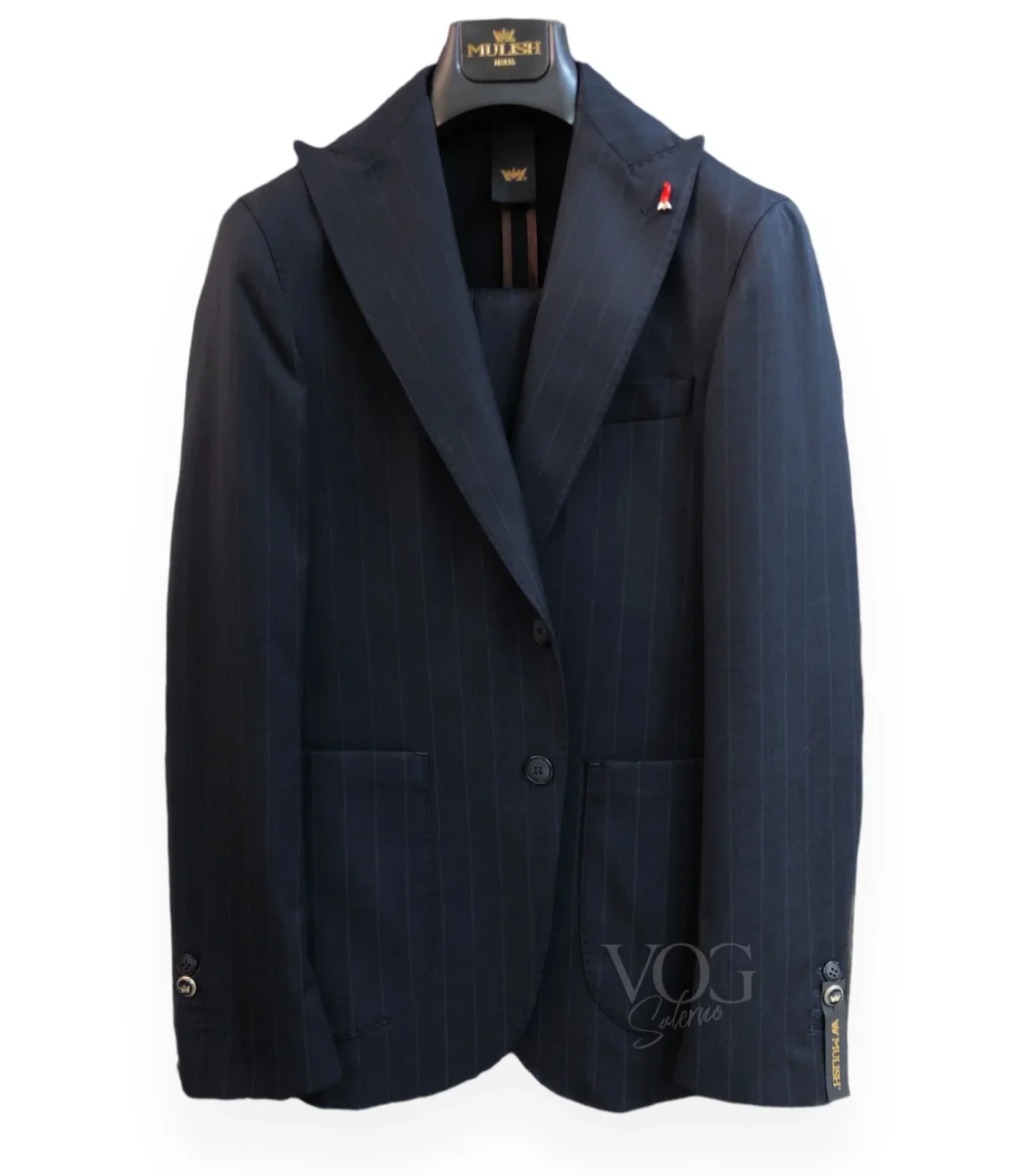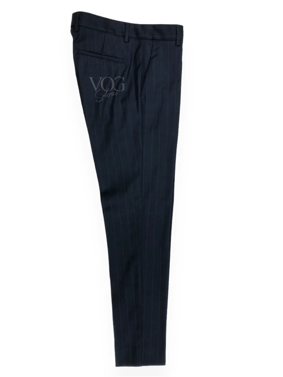 Abito vestibilit slim in tessuto misto viscosa mano calda motivo gessato. Collo con revers a lancia, dettaglio impunture su tutta la lunghezza, tasche quadrate applicate. Chiusura a due bottoni. Capo non foderato. Pantalone vita regolare, cinturino con passanti, chiusura con bottone e gancio e zip. Gamba e fondo stretti. Composizione tessuto