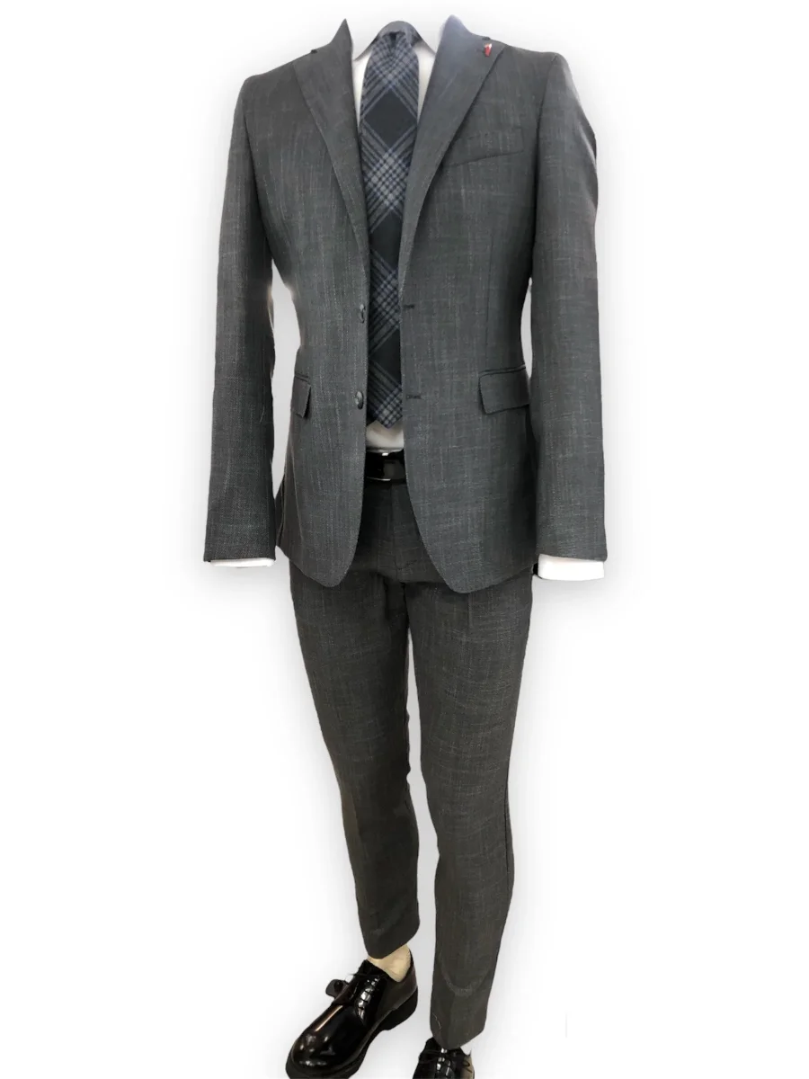 Abito uomo vestibilità slim in tessuto misto viscosa. Fantasia occhio di pernice. Giacca sagomata, collo con revers regolari, chiusura a due bottoni, tasche con pattina applicata sul davanti. Pantaloni slim fit, vita con cinturino chiuso da bottone esterno e gancio interno, gamba e fondo slim. Taglia in foto 48. Composizione tessuto 84% poliestere 14% viscosa 2% elastan.