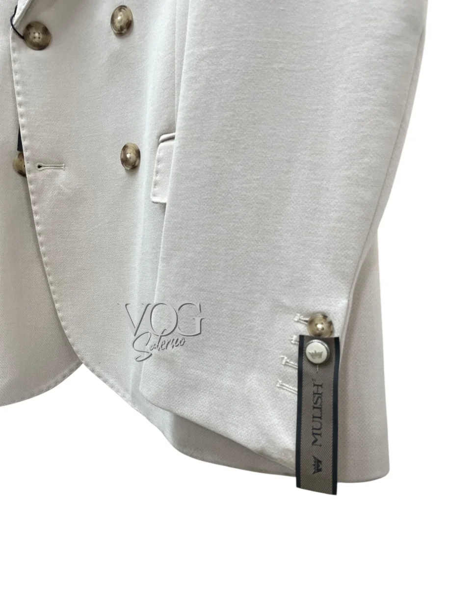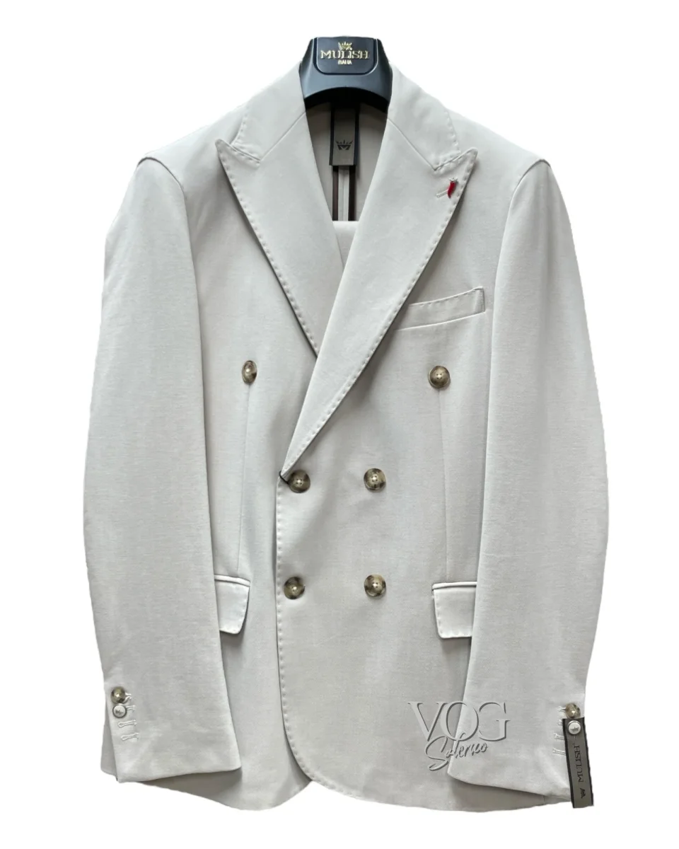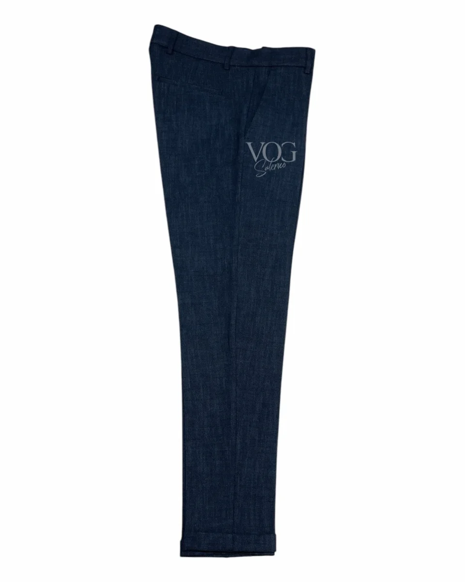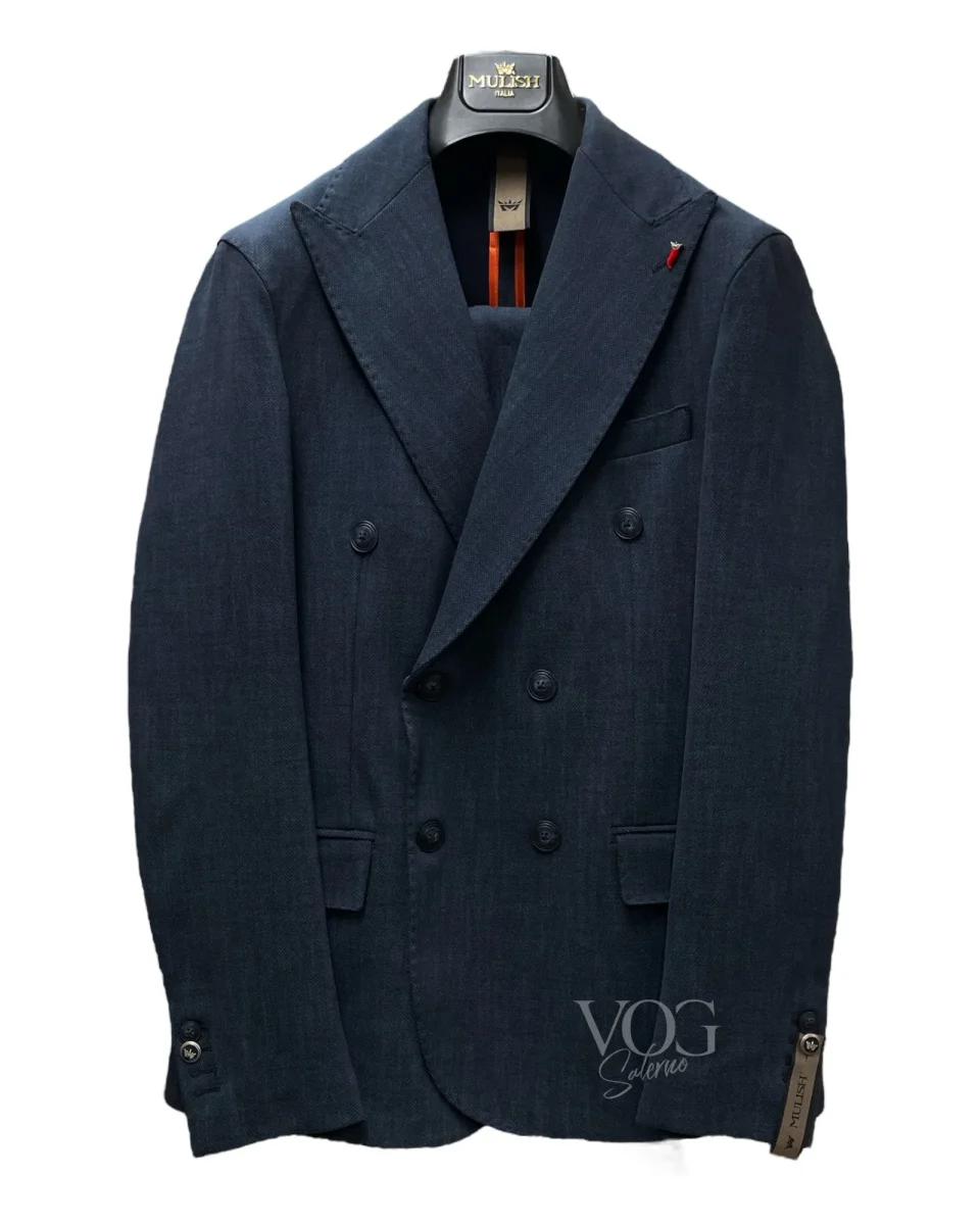 Abito in tessuto lavorato misto viscosa . Collo con revers a lancia, chiusura doppio petto con bottoni screziati in tinta. Tasche con pattina applicata e taschino sul petto. Capo non foderato, riprese interne rivestite in fettuccia rasata colore a contrasto. Pantalone slim fit. Vita regolare, cinturino fisso con passanti, chiusura pattina lunga con bottone e gancio interno e zip, tasche a filo laterali. Gamba e fondo stretti. Vestibilità slim. Composizione tessuto 65% viscosa, 30% poliammide, 5% elastan.