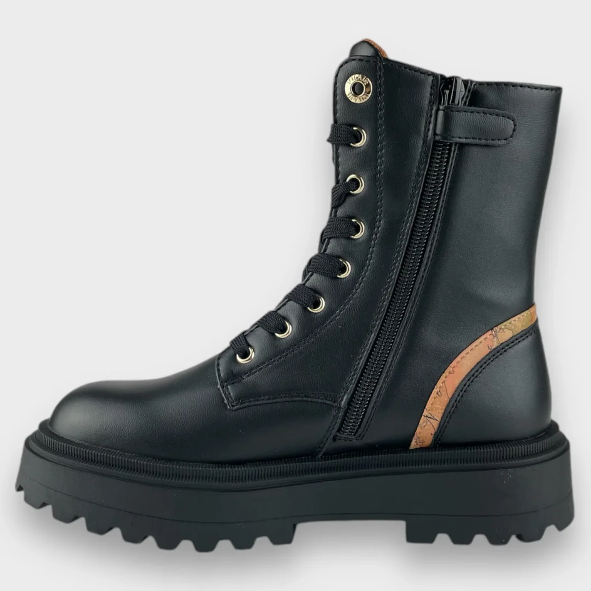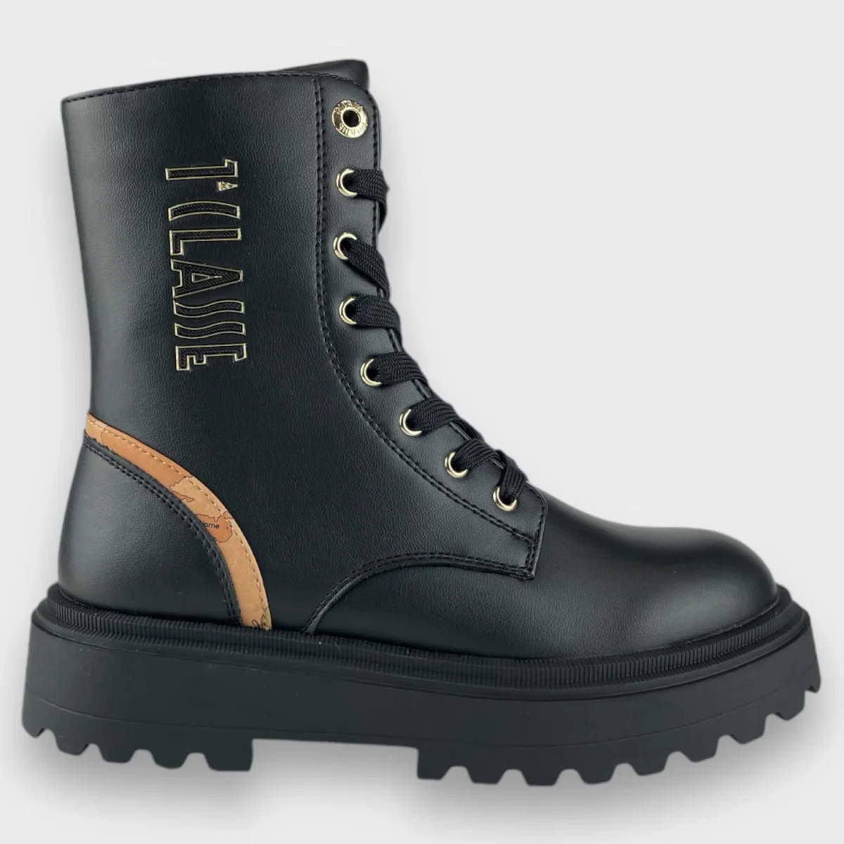 Anfibi ALVIERO MARTINI 1 CLASSE con rifinitura a fantasia istituzionale, logo a rilievo, chiusura con lacci e zip laterale per facilitare la calzata. fondo in gomma antiscivolo.