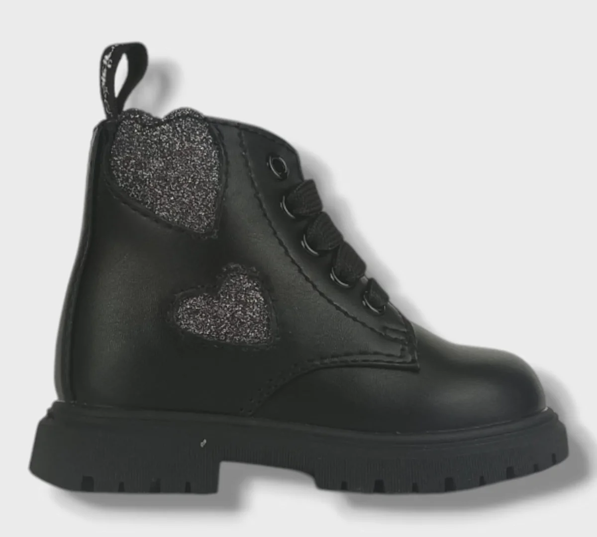 Anfibio BALDUCCI in ecopelle con patchs cuori applicati ,chiusura lacci e zip laterale, sottopiede in vera pelle ,fondo leggero e flessibile in gomma antiscivolo.