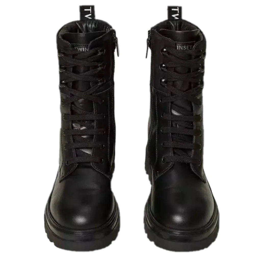 Scarpa TWINSET modello anfibio in VERA PELLE con chiusura lacci e zip laterale per facilitare la calzata logo TWINSET sul retro fodera interna e sottopiede in vera pelle fondo in gomma antiscivolo.