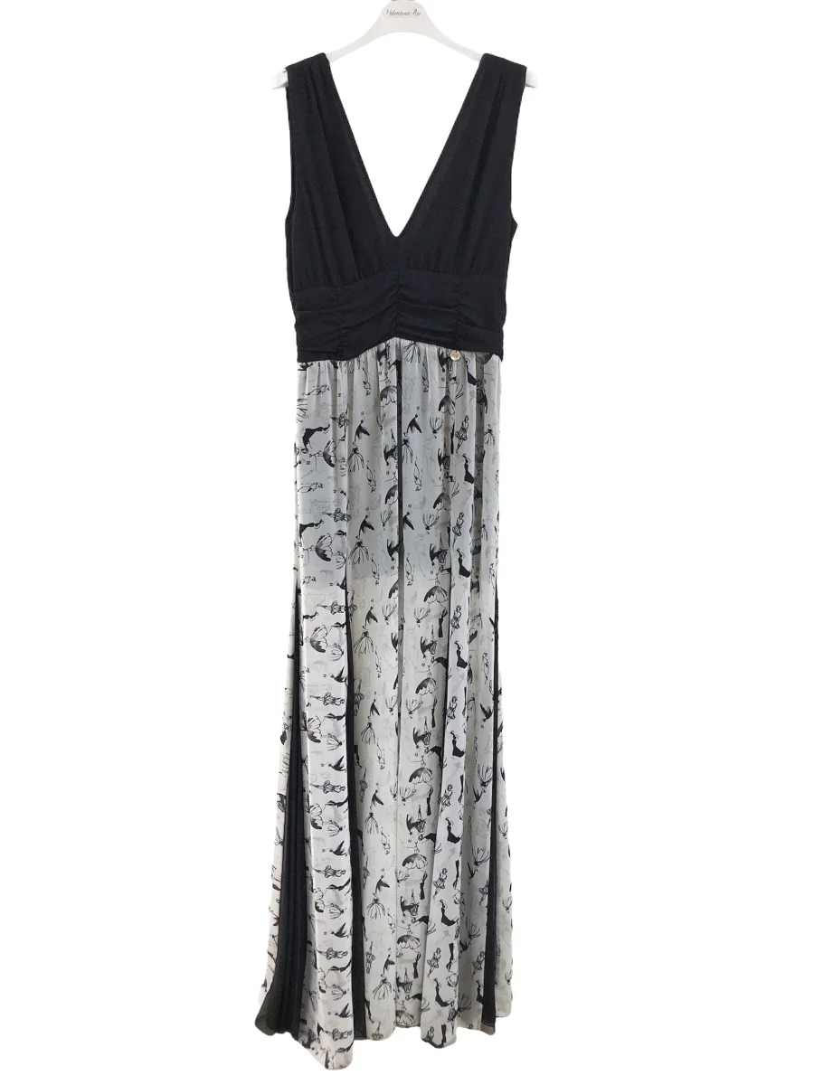 Vestito lungo con corpetto in tessuto elasticizzato, scollo a V con drappeggio in vita e sul seno. Gonna ampia in chiffon con particolare stampa ballerine ed inserti tinta unita sul fondo.