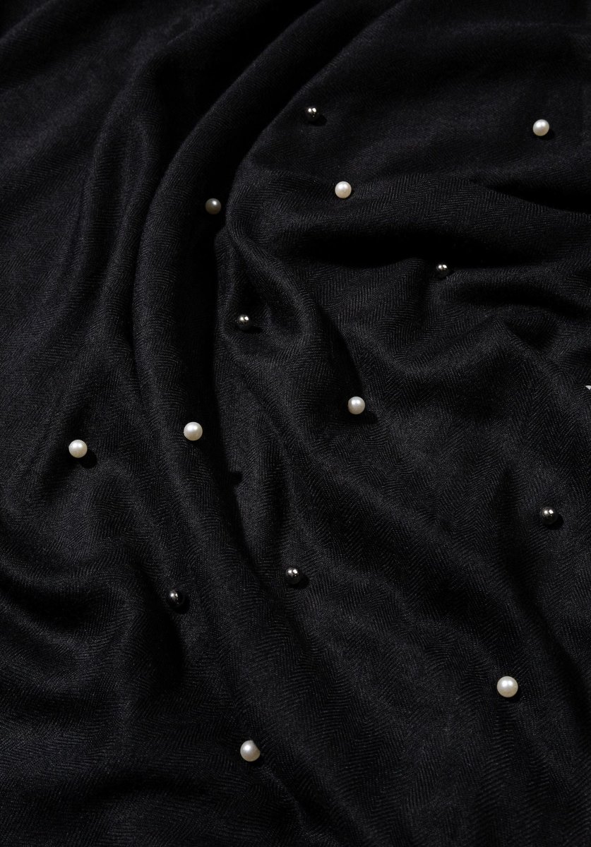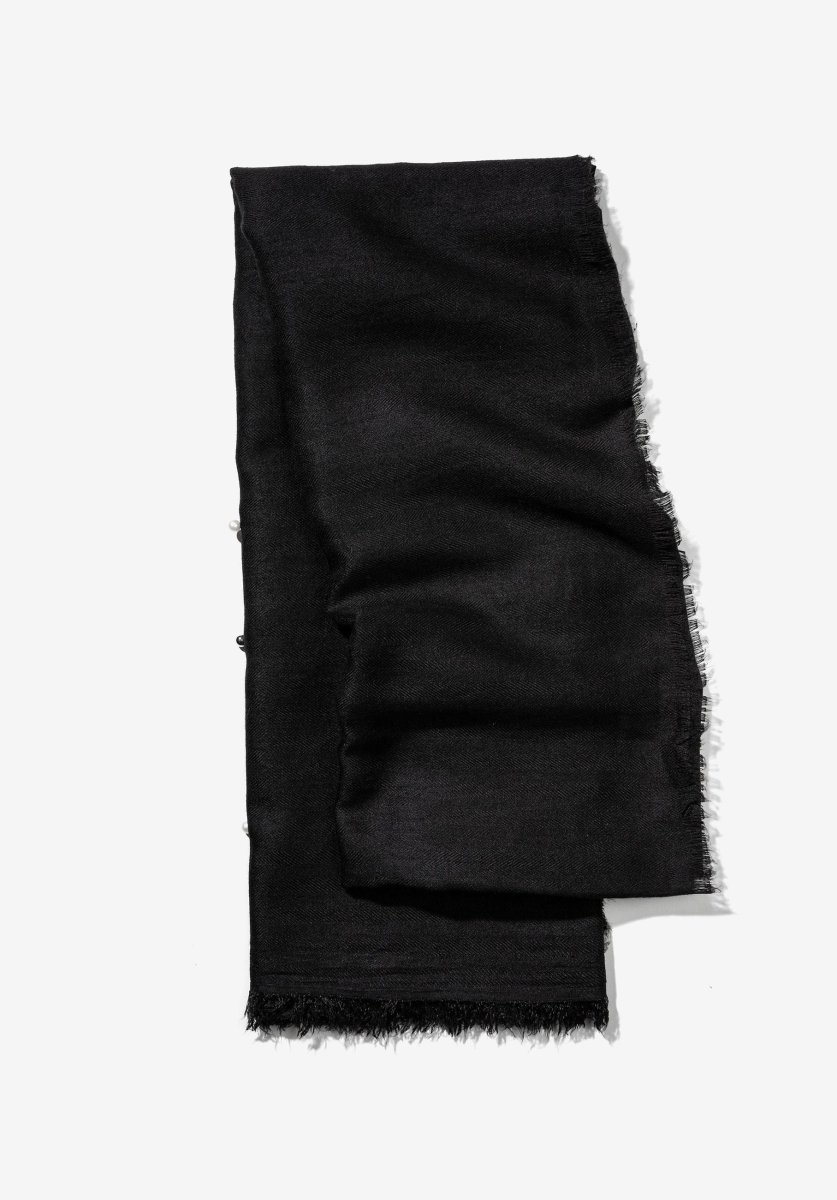 Sciarpa leggera modello pashmina con perle applicate. Bordi sfrangiati.
