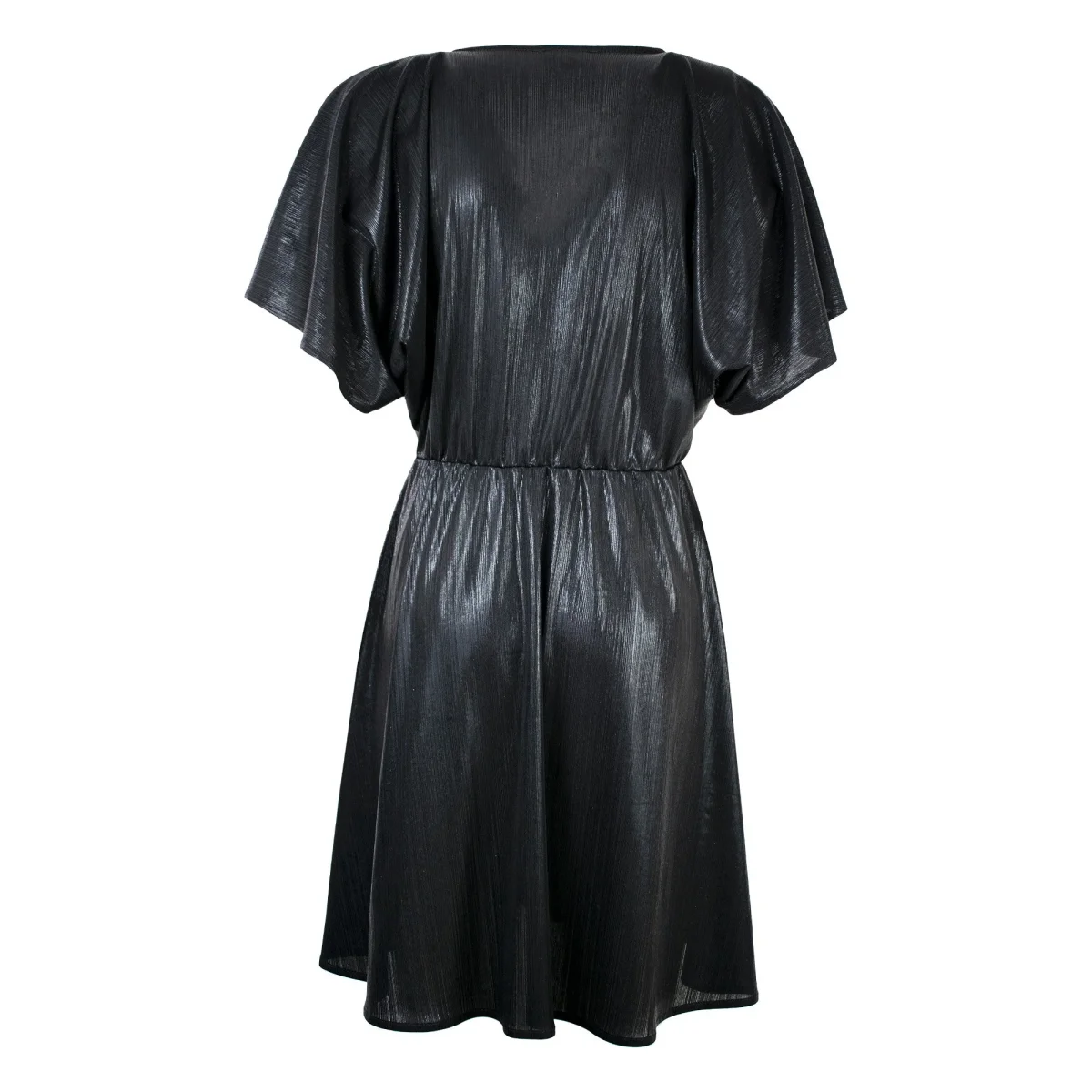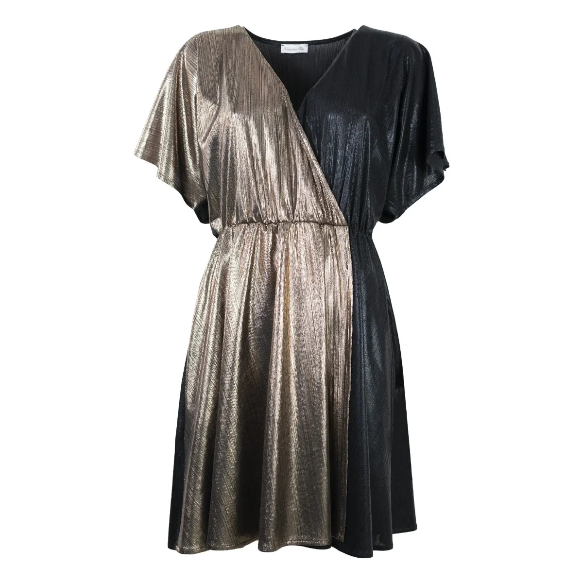 Vestito lunghezza mini in tessuto spalmato bicolore bronzo e nero elasticizzato. Scollo a V profondo, maniche a pipistrello. Elastico in vita per modulare la vestibilità. Mini gonna morbida a campana.