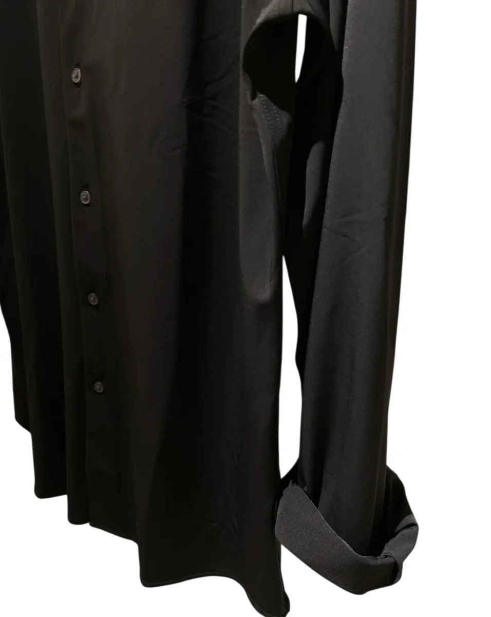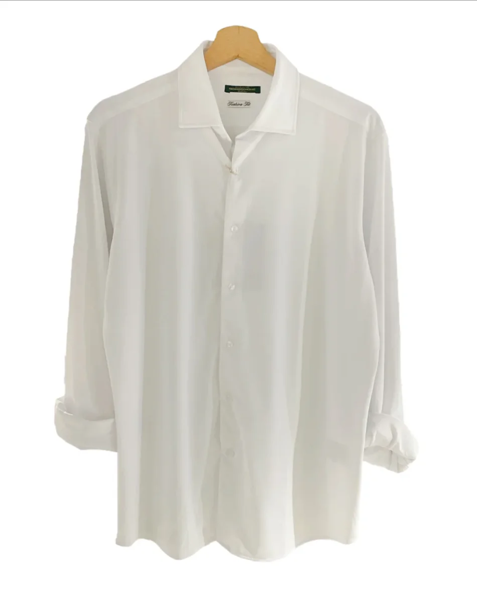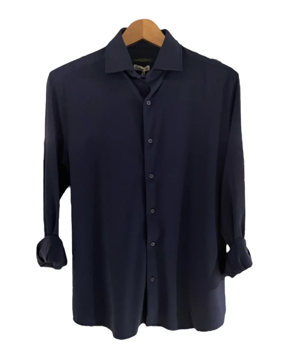 Camicia in particolare tessuto tecnico leggero. Colletto piccolo, chiusura con bottoni in tinta. Vestibilità regolare. Composizione tessuto 76% poliammide 24% elastan.