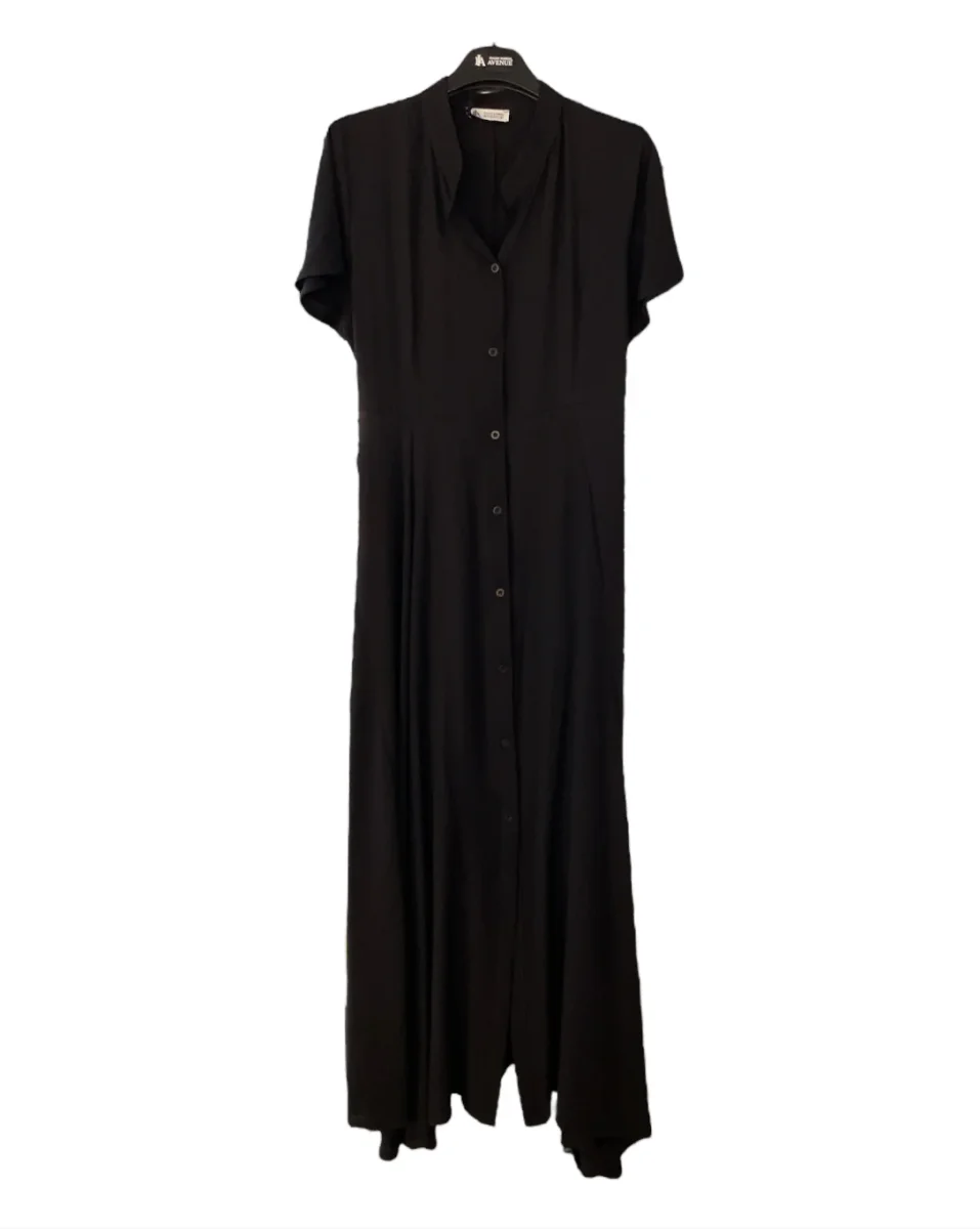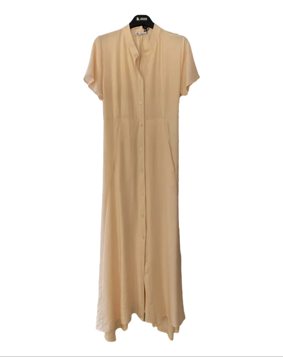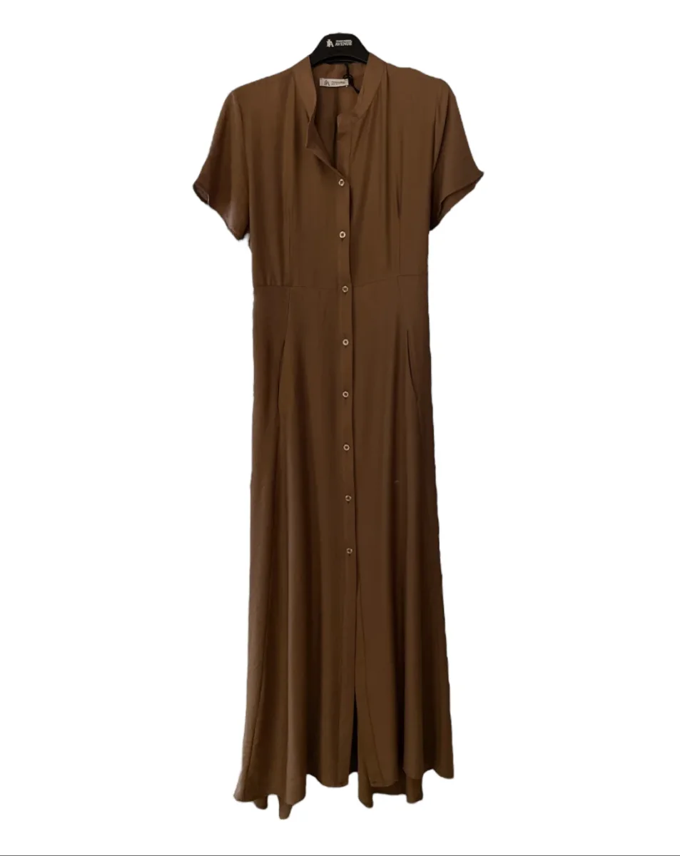 Vestito longuette modello chemisier. Collo coreano, scollo a punta, bottoni in tinta. Tasche laterali. Vestibilità dritta. Veste dalla XS alla L. Composizione tessuto 87% viscosa 13% nylon.