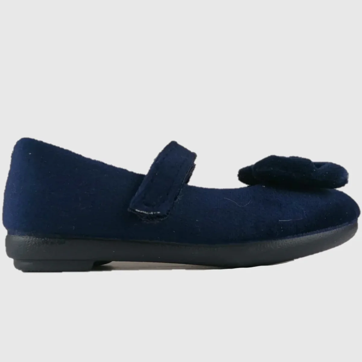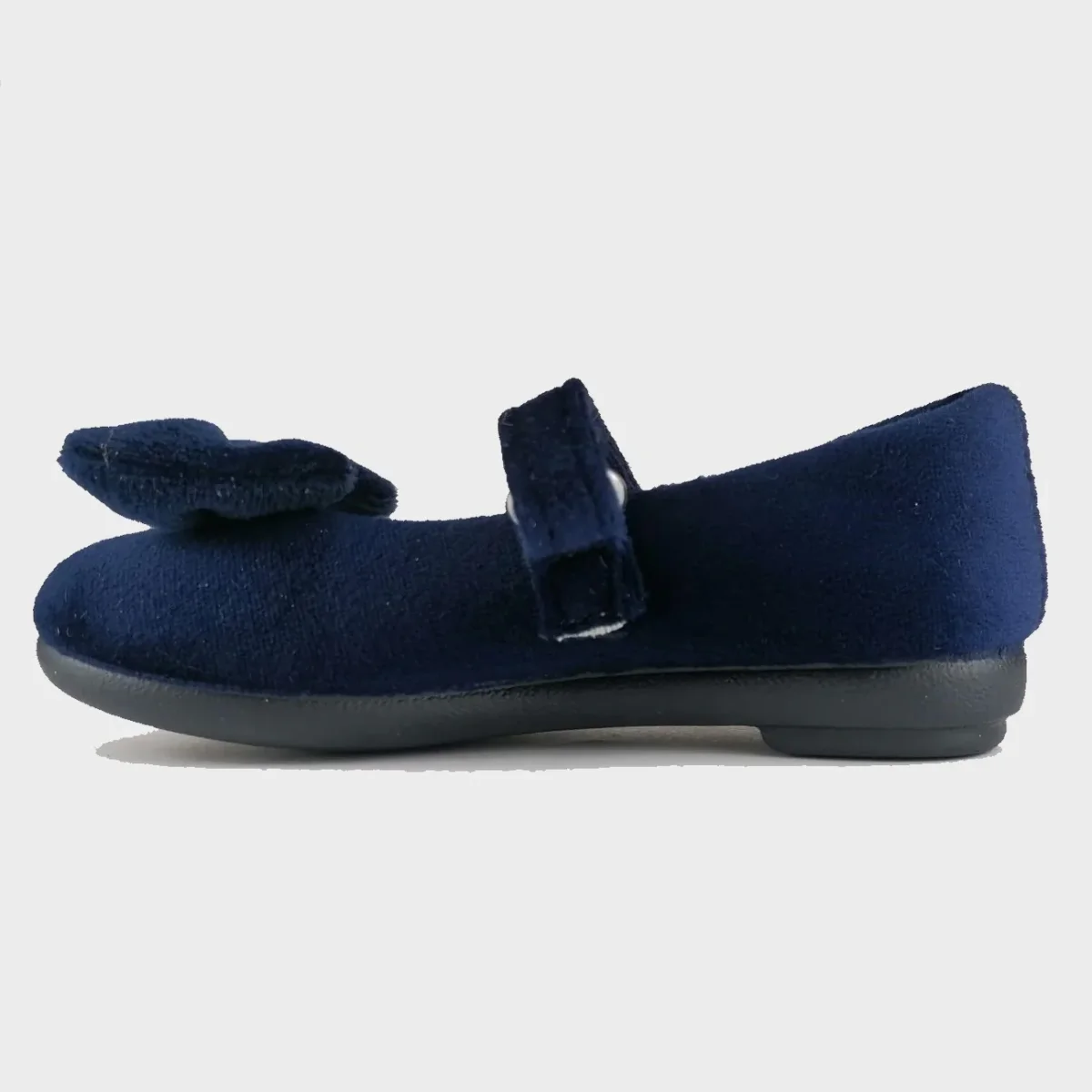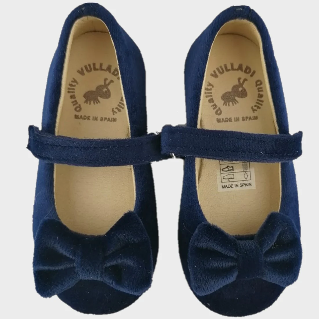 Ballerina VULLADI in velluto blu, chiusura velcro , fiocco applicato alla punta ,fondo leggero e flessibile in gomma. Made in Spain.