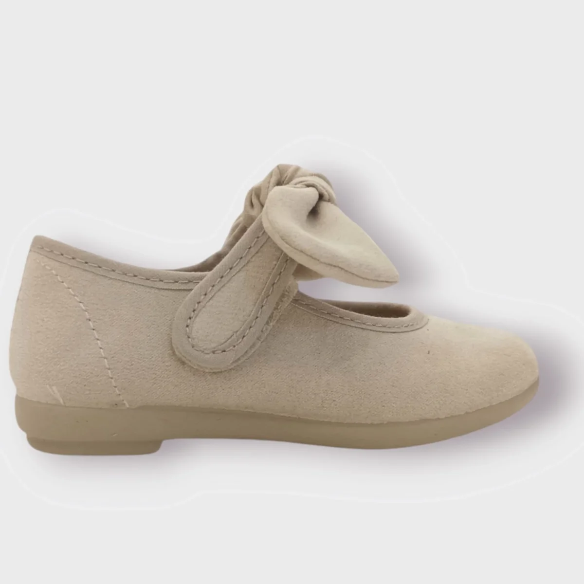 Ballerina VULLADI in velluto beige , chiusura velcro con fiocco applicato ,fondo leggero e flessibile in gomma. Made in Spain