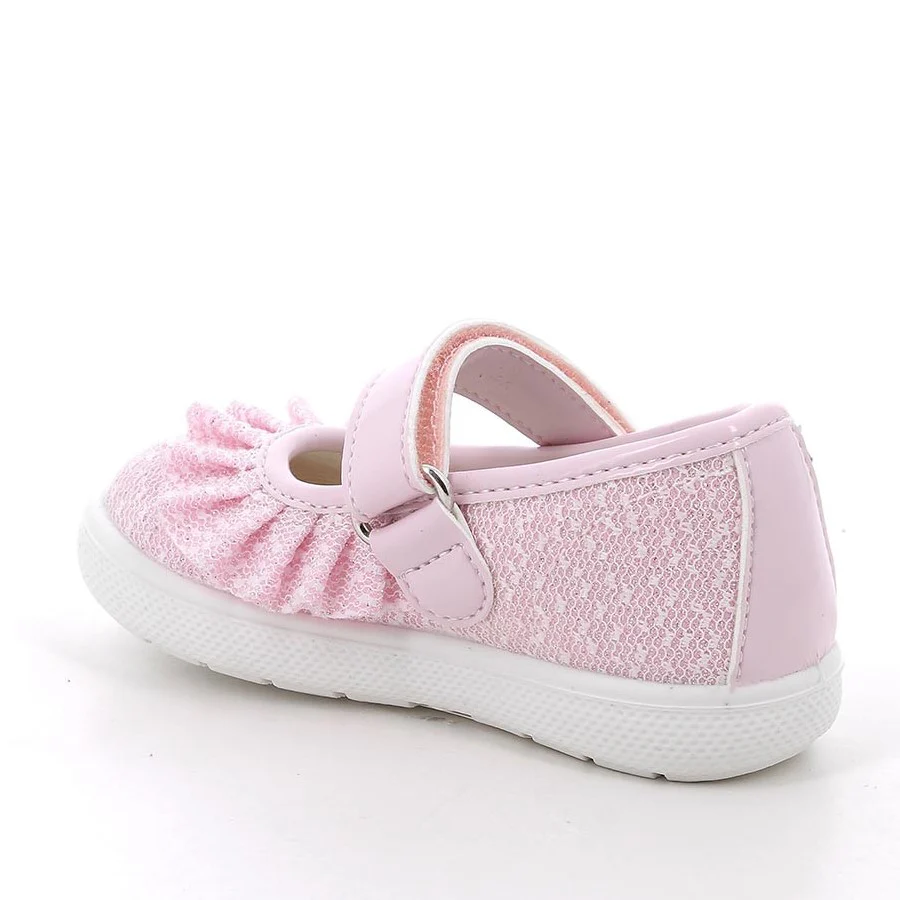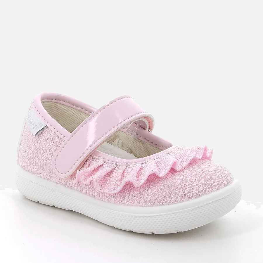 Ballerine PRIMIGI, modello primi passi, in tessuto glitterato con chiusura con velcro in vernice, fondo in gomma antiscivolo, suoletta in vera pelle.