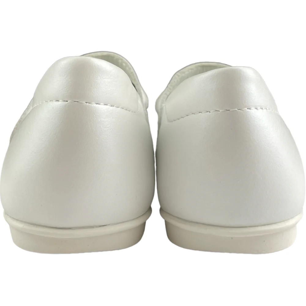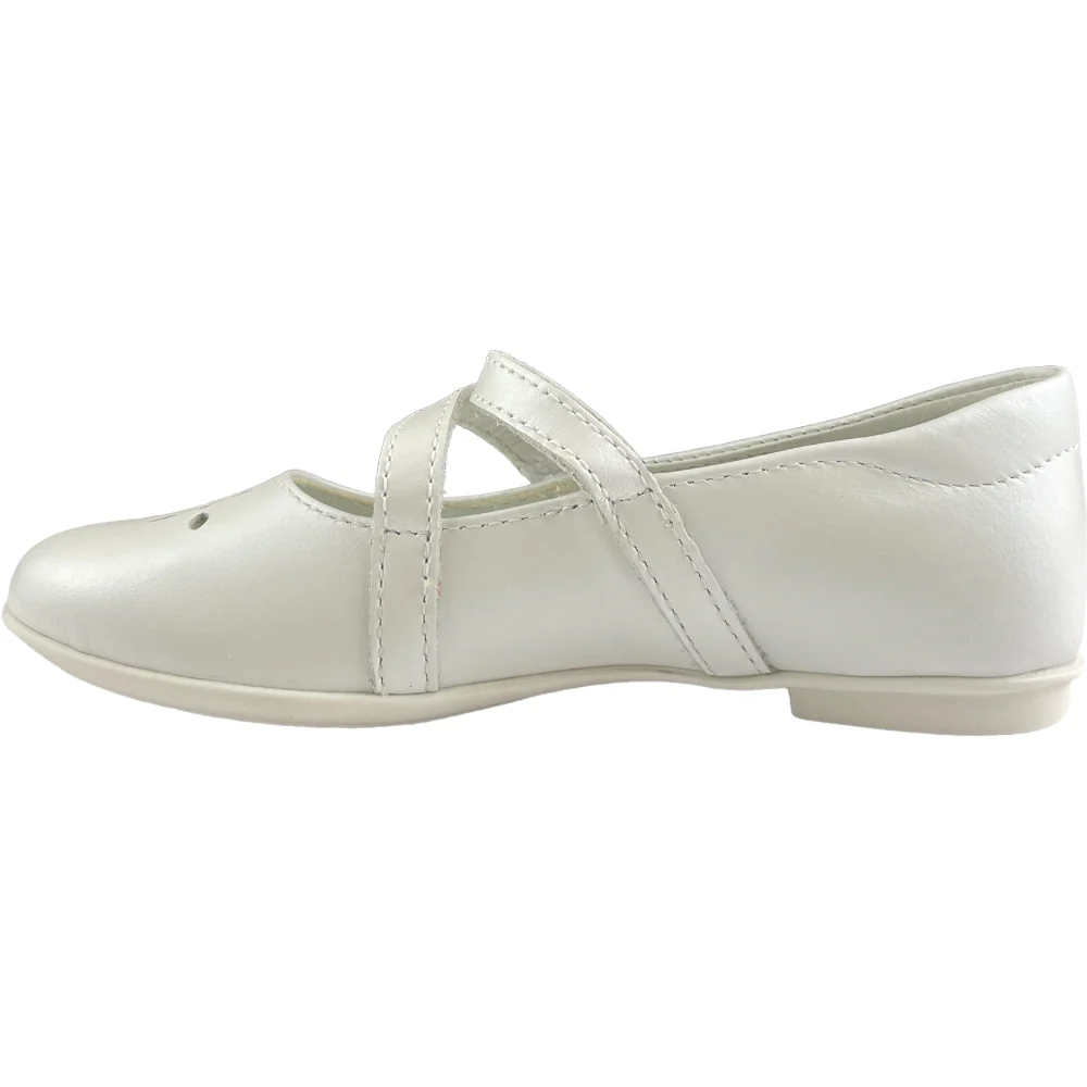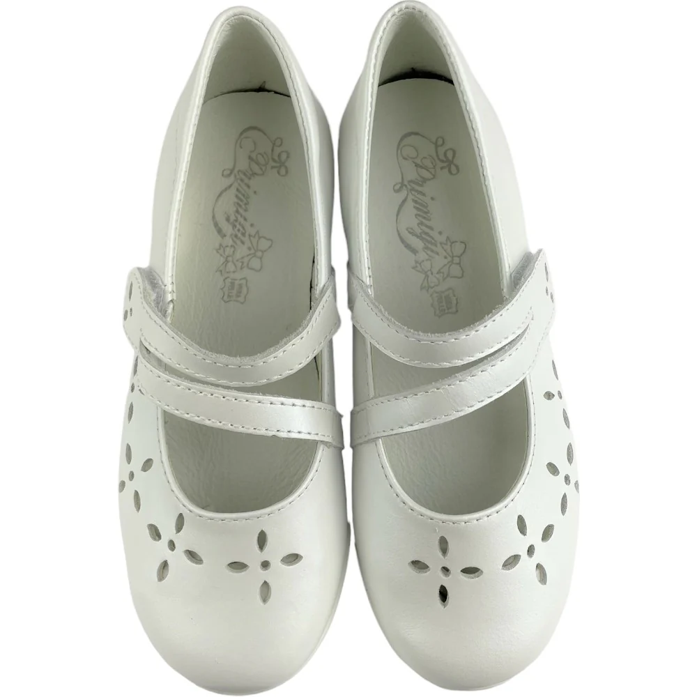 Scarpa Ballerina PRIMIGI in pelle bianca perlata con lavorazioni a contrasto cinturino regolabile con velcro per adattarsi a qualsiasi tipo di piede. fondo in gomma antiscivolo.