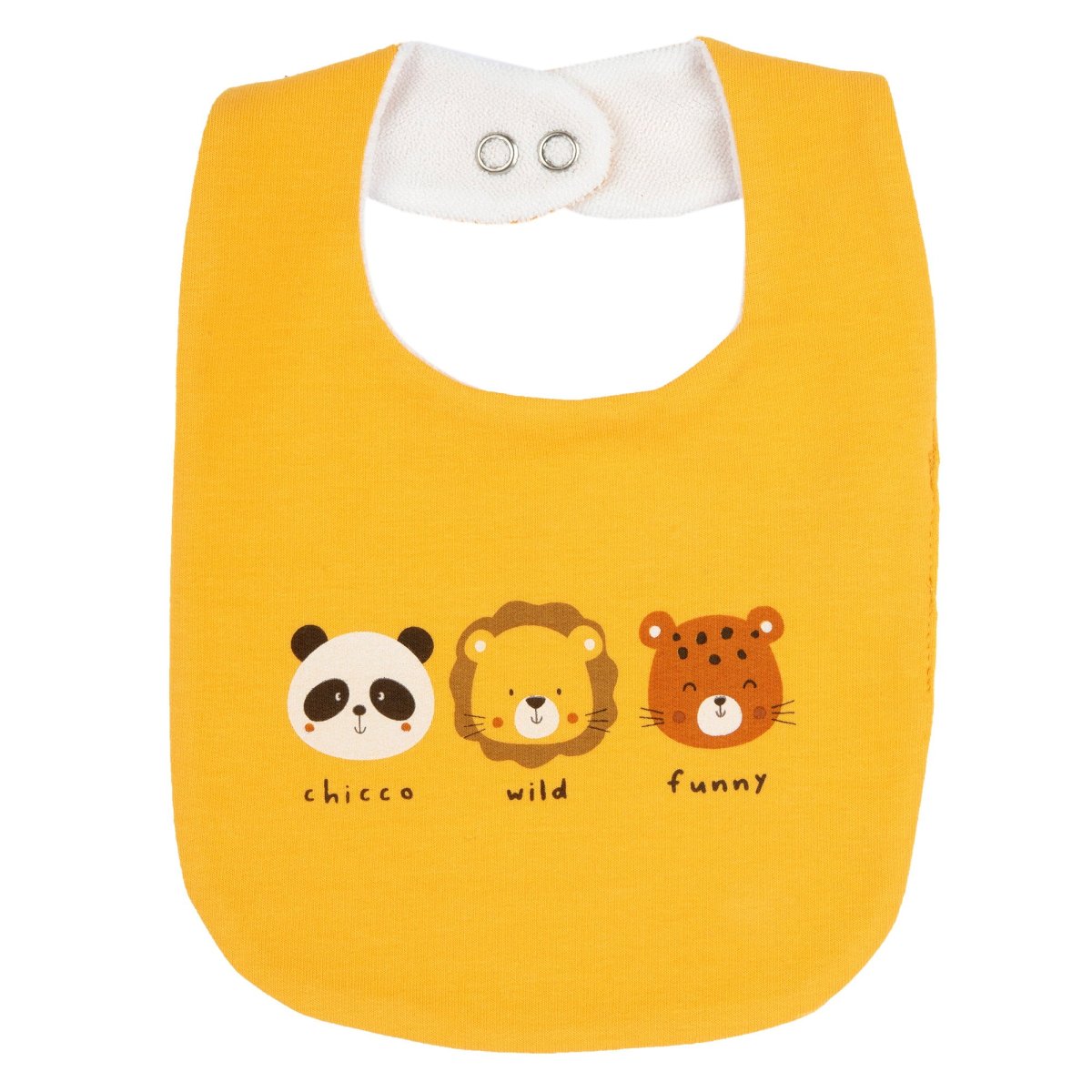 Bavetta CHICCO in cotone con retro in spugna, stampa applicata in colori a contrasto, logo stampato applicato, chiusura con clips logata regolabile.