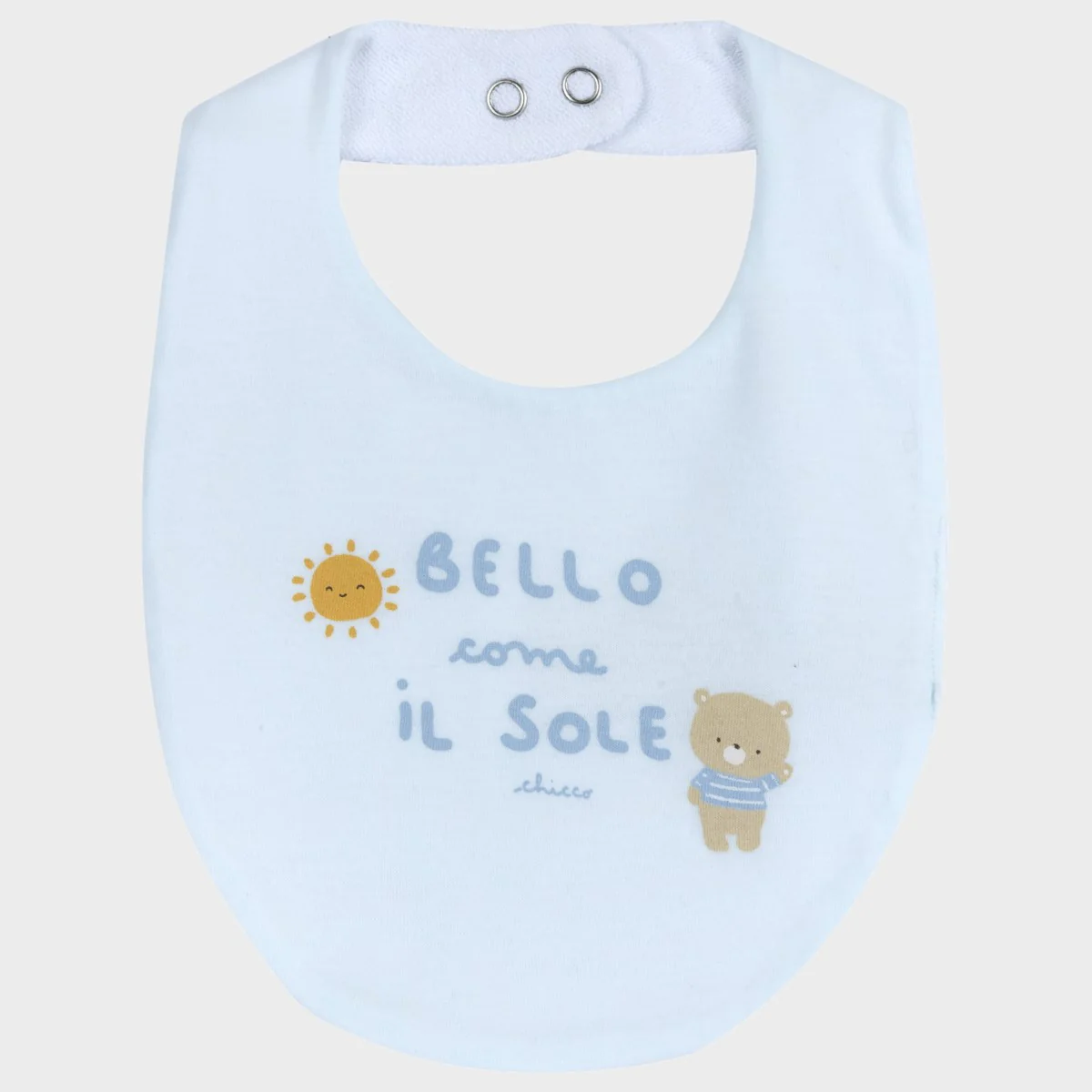 Bavetta CHICCO in cotone con stampa e logo stampato applicato, retro in spugna, chiusura con clips regolabile.