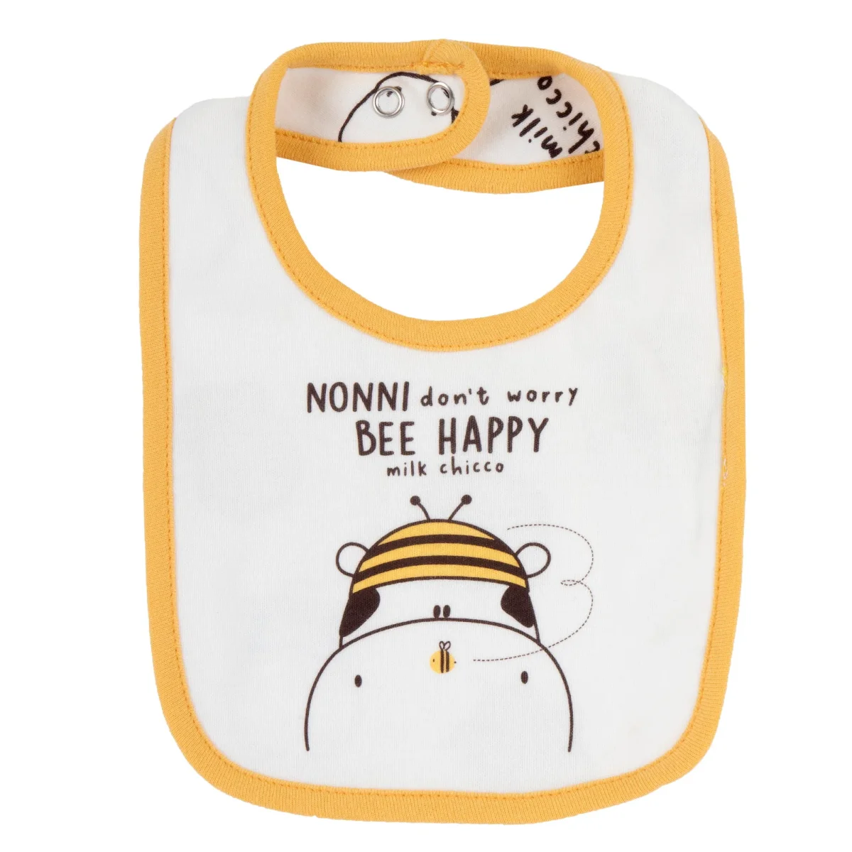 Bavetta CHICCO in cotone con stampa e logo stampato applicato in colori a contrasto, retro a fantasia, chiusura con clips regolabile.