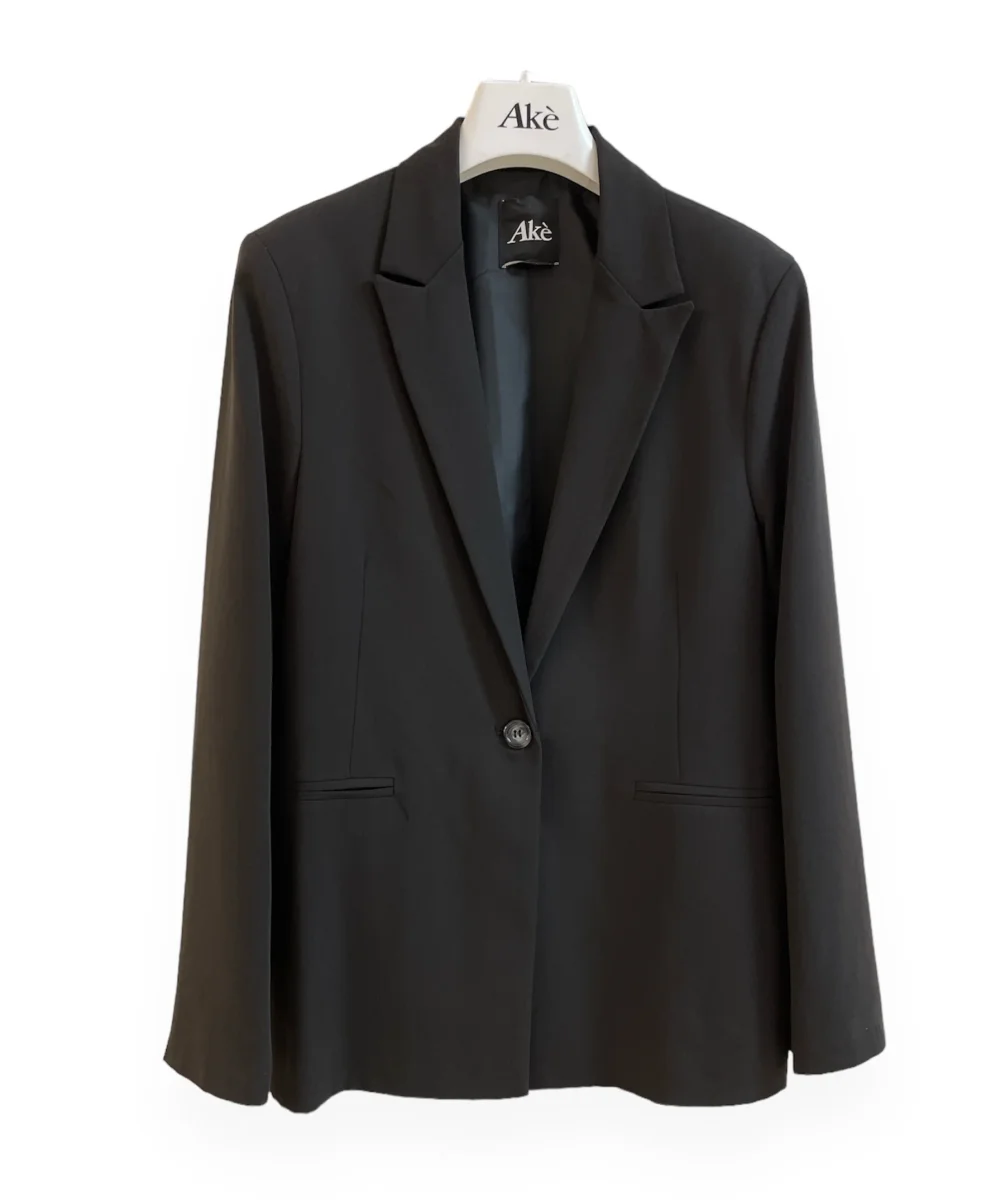 Giacca in tessuto tecnico elasticizzato misto viscosa. Modello blazer. Collo con revers regolari, chiusura centrale ad un bottone. Maniche lunghe, capo foderato. Vestibilità dritta slim. Crea il tailleur con il pantalone abbinato. Composizione tessuto 78% poliestere 18% viscosa 4% elastan.