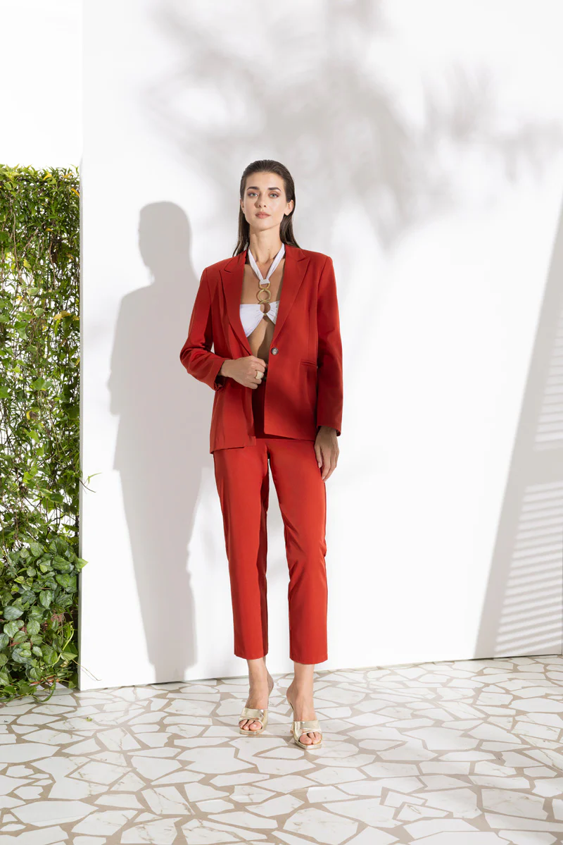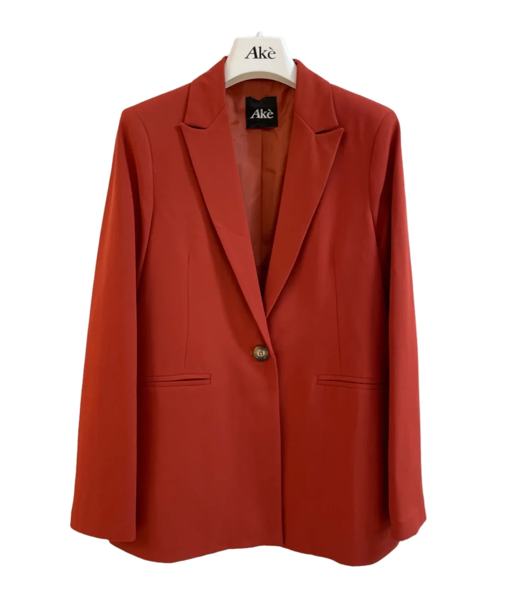 Giacca in tessuto tecnico elasticizzato misto viscosa. Modello blazer. Collo con revers regolari, chiusura centrale ad un bottone. Maniche lunghe, capo foderato. Vestibilità dritta slim. Crea il tailleur con il pantalone abbinato. Composizione tessuto 78% poliestere 18% viscosa 4% elastan.