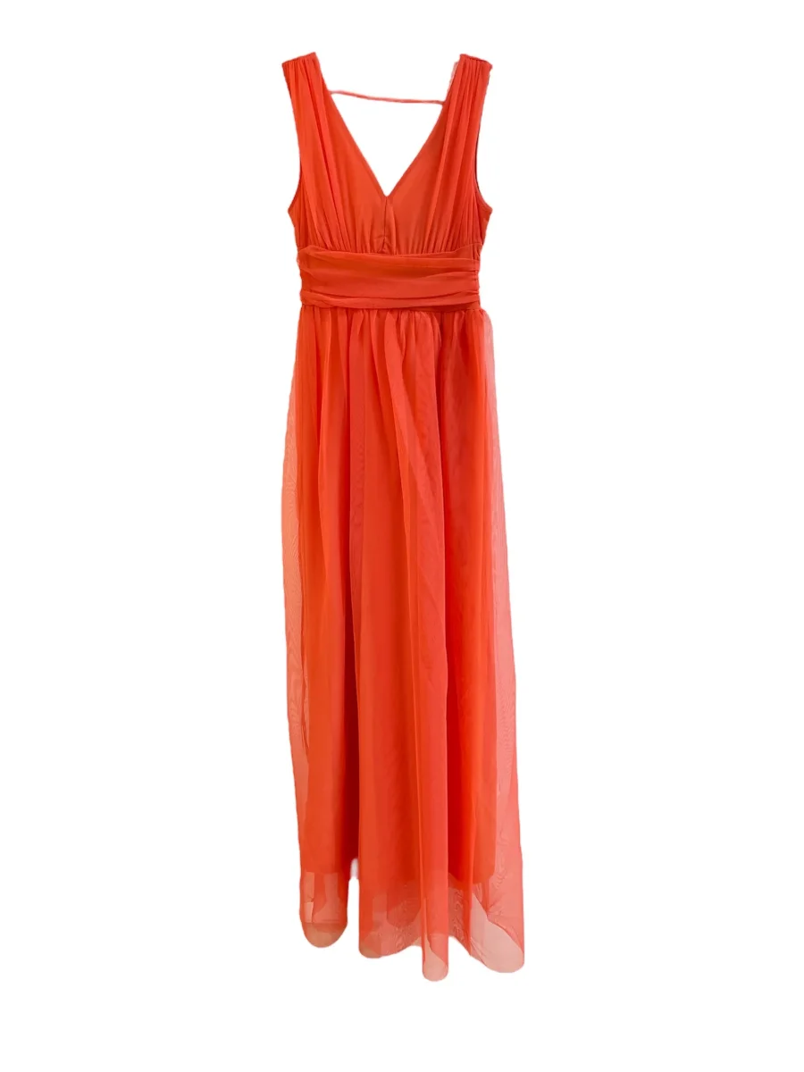 Vestito lungo elegante in tessuto tulle. Scollo a punta, corpetto arricciato, fascia alta elastica in vita. Gonna lunga morbida, fodera in tessuto elasticizzato in tinta.