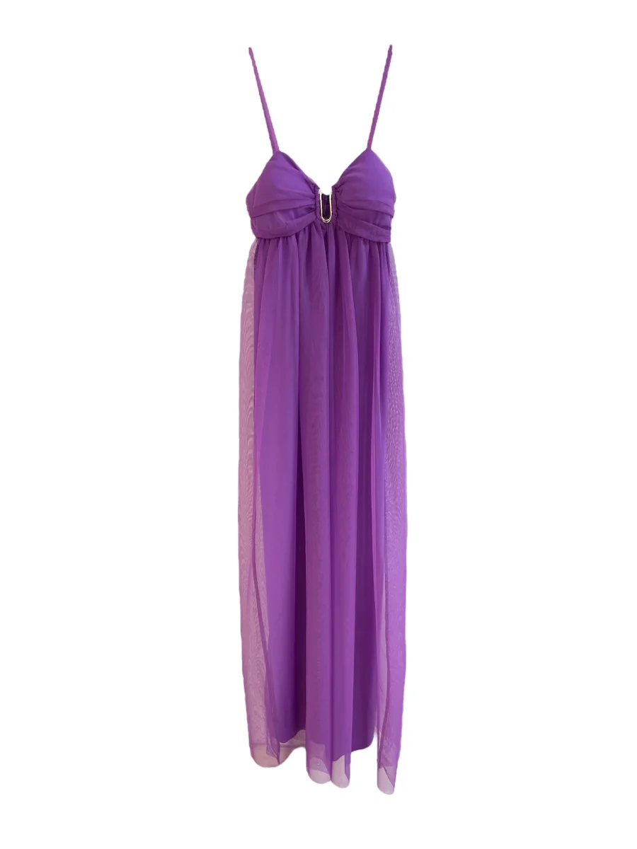 Vestito lungo in tessuto tulle. Scollo a cuore con spacchetto centrale con gancio in metallo, bretelle sottili elasticizzate regolabili. Taglio impero. Gonna lunga morbida. Sottogonna in tessuto elasticizzato in tinta. Vestibilità regolare.