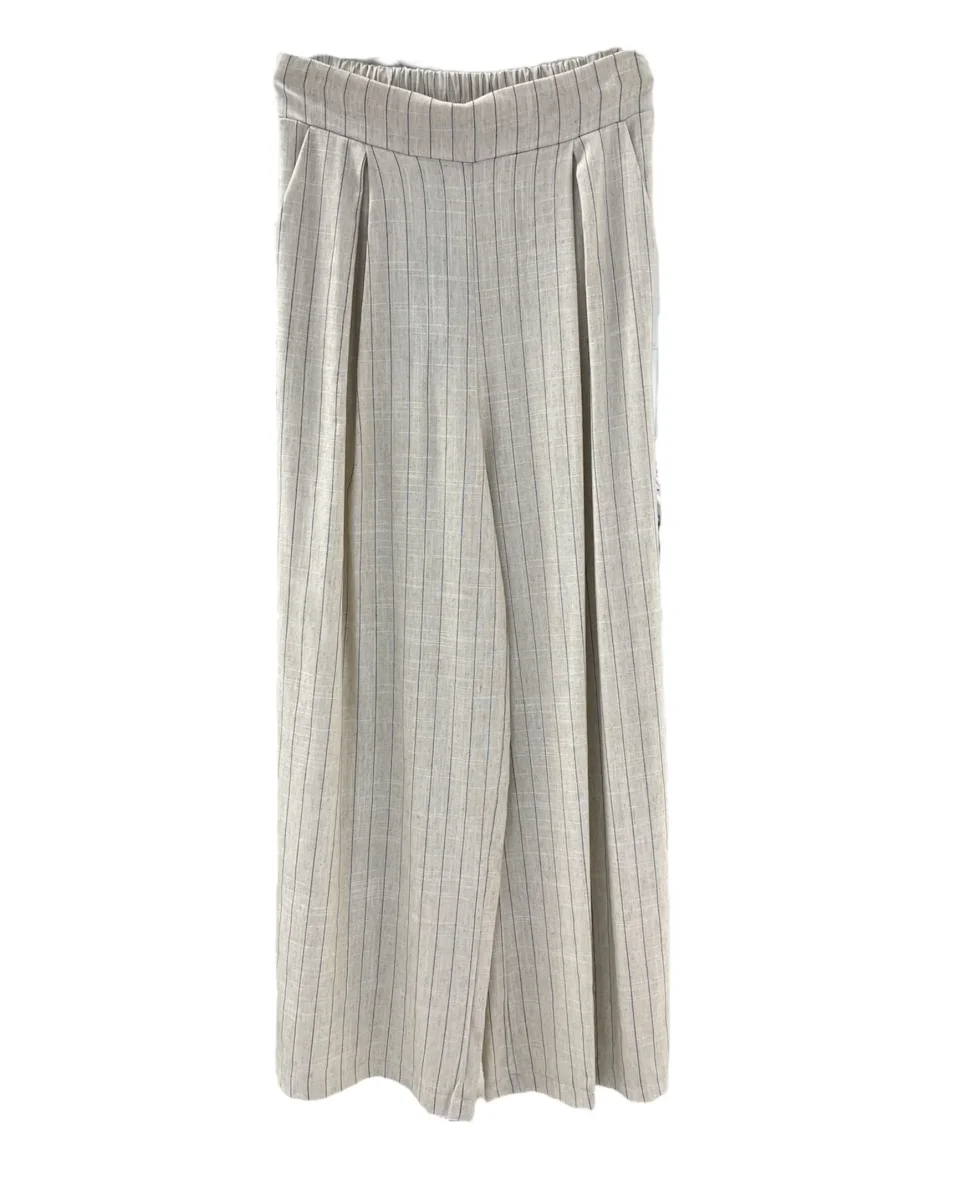 Pantalone in tessuto misto lino/viscosa. Vita alta con cinturino fisso sul davanti e con elastico sulla schiena. Tasche a filo laterali. Gamba e fondo ampi. Crea il tailleur con la giacca abbinata . Composizione tessuto 70% viscosa 30% lino.