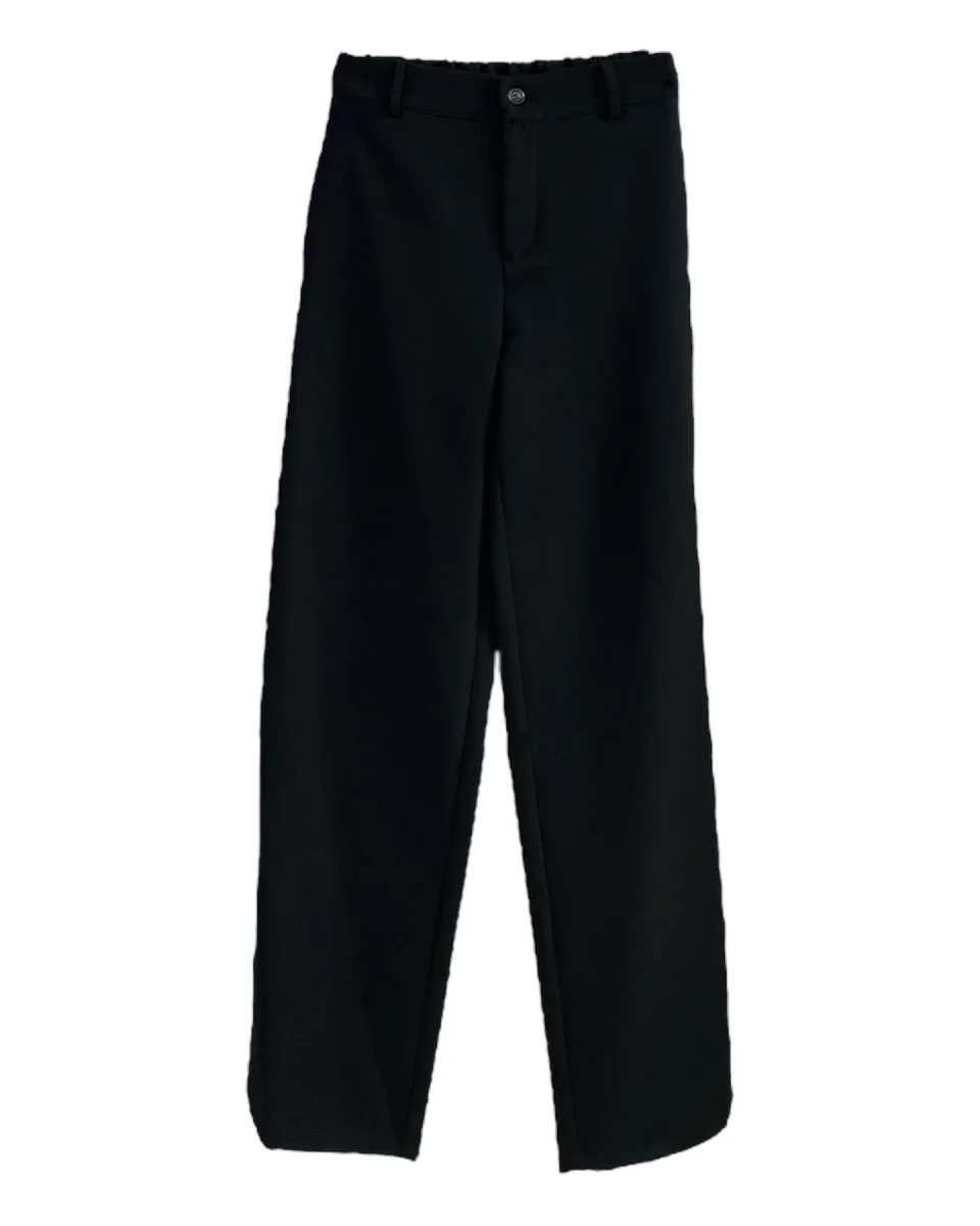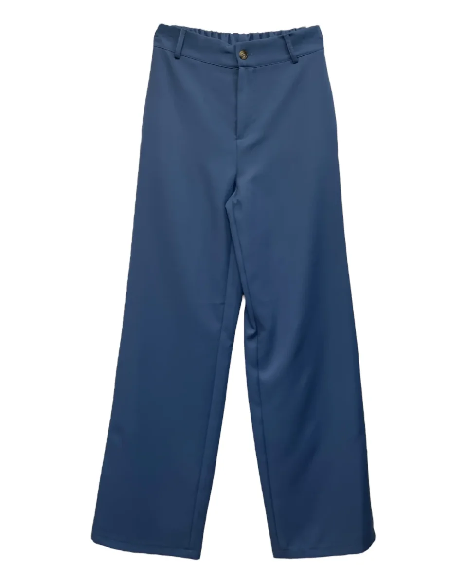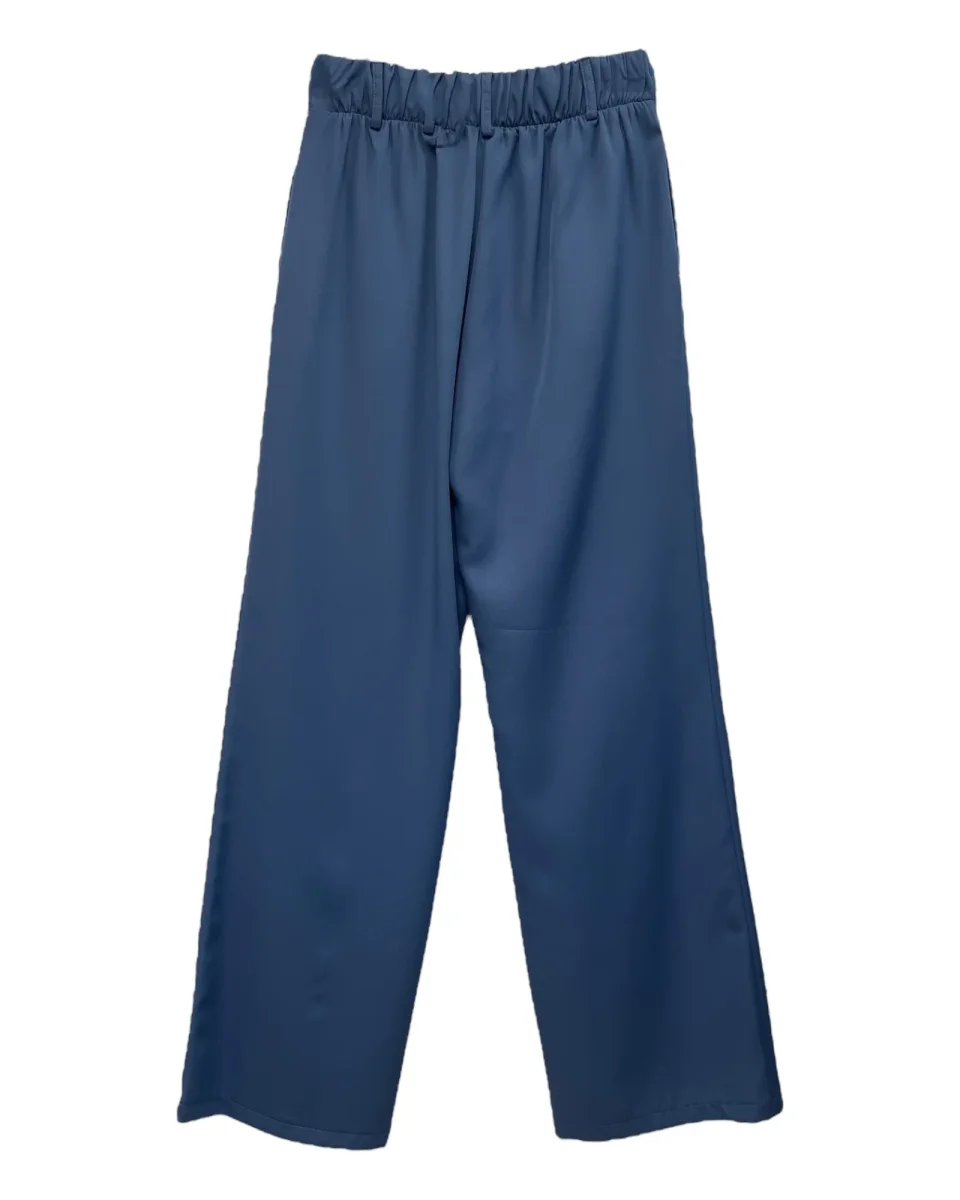 Pantalone palazzo in tessuto tecnico elasticizzato. Cinturino con elastico sulla schiena e chiusura con zip e bottone, tasche laterali. Gamba ampia e fondo palazzo. Vestibilità regolare. Crea il tailleur con la giacca blazer abbinata.