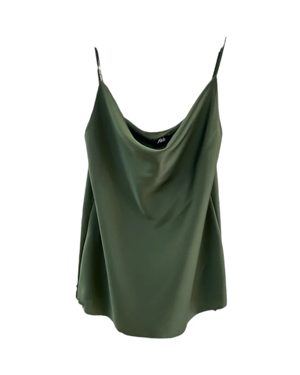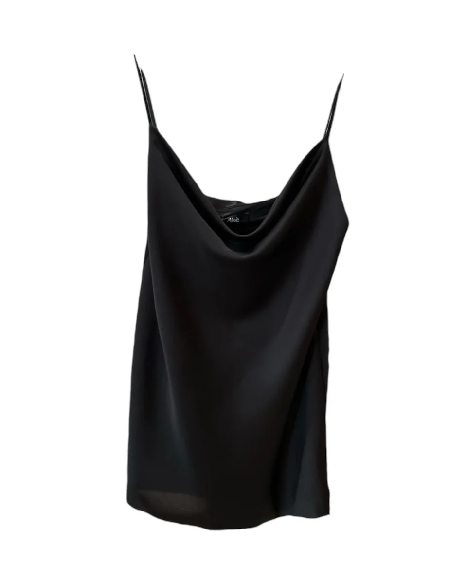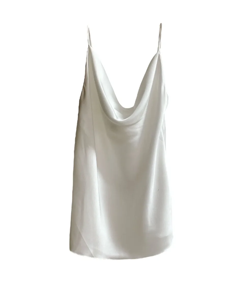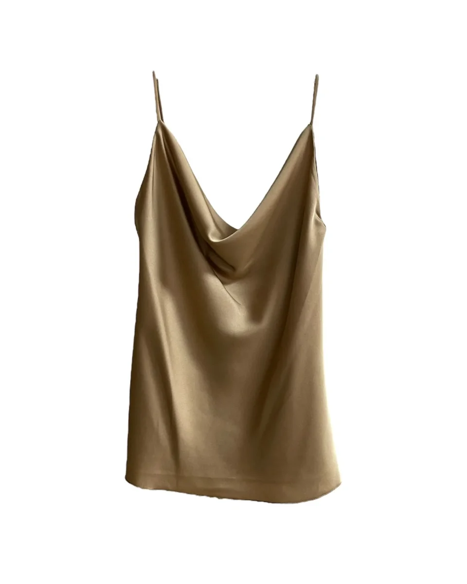 Top basico in tessuto lucido effetto raso. Bretelle sottili, scollo a cascata. Lunghezza in vita, fondo stondato. Vestibilità morbida.