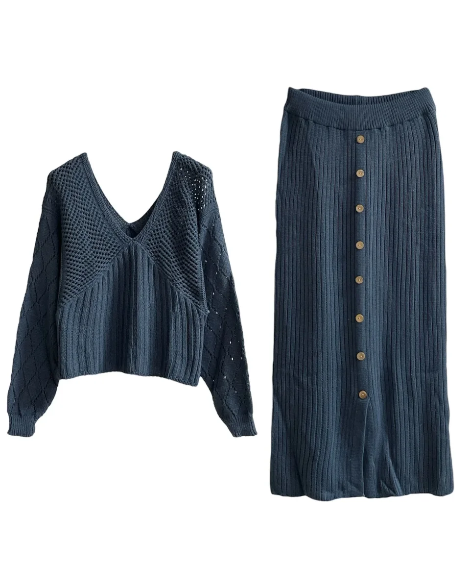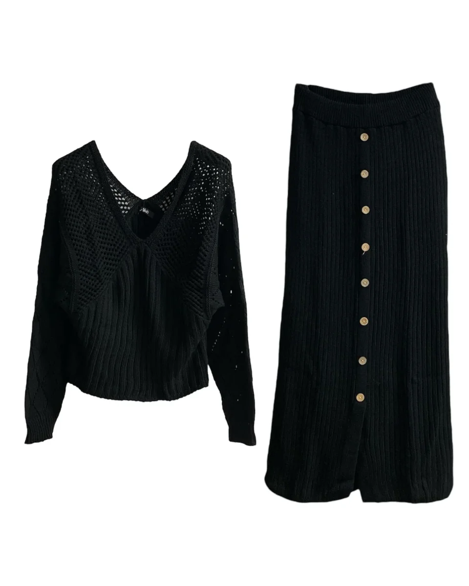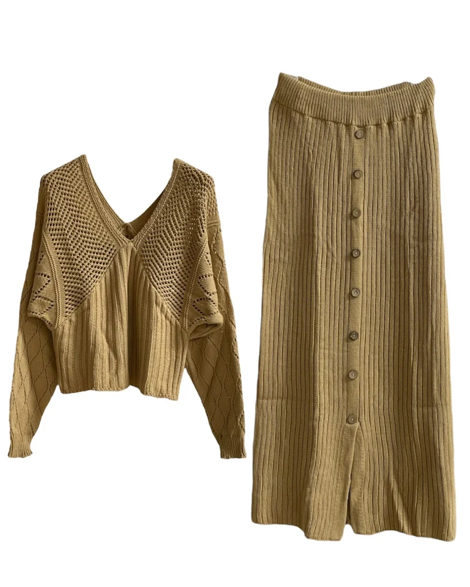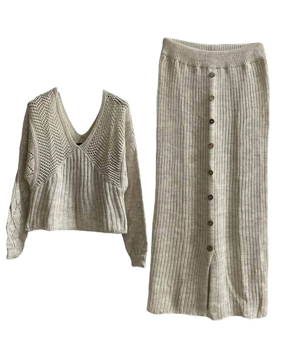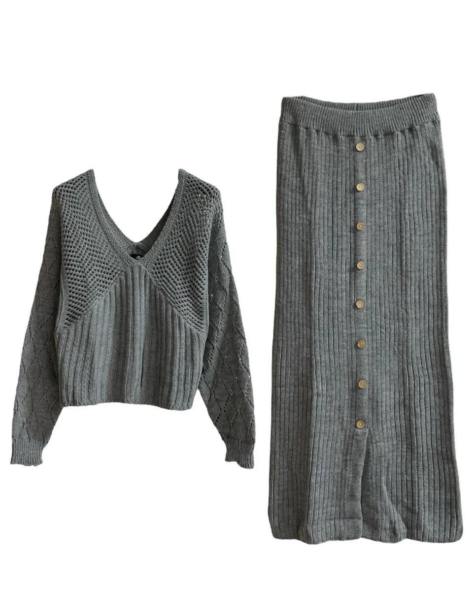 Coordinato in maglia lavorata. Maglia crop con scollo a V profondo, maniche lunghe a lavorazione larga. Gonna lunga con finti bottoni, spacchetto sul davanti sul fondo. Vestibilità regolare.