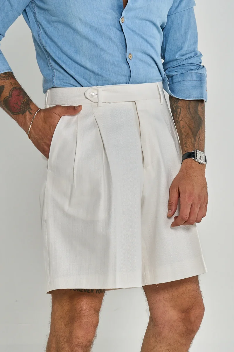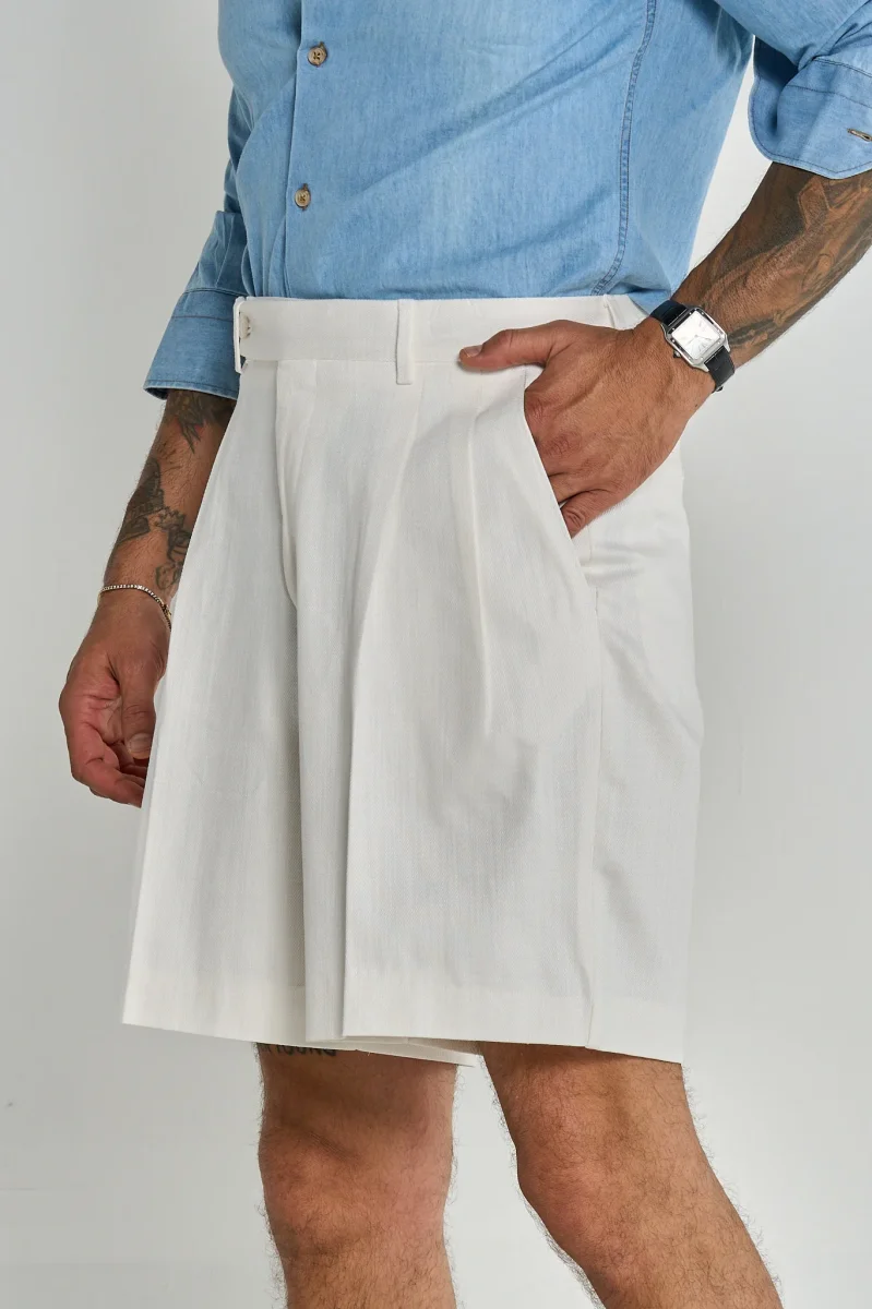 Questo bermuda è un capo elegante e raffinato, ideale per la stagione estiva. Presenta una struttura sartoriale con pieghe frontali che donano volume e movimento, una chiusura con bottone laterale e passanti per cintura. Il taglio è ampio e comodo, ma mantiene un aspetto sofisticato. Perfetto da abbinare a una camicia o una polo per un look smart casual.
