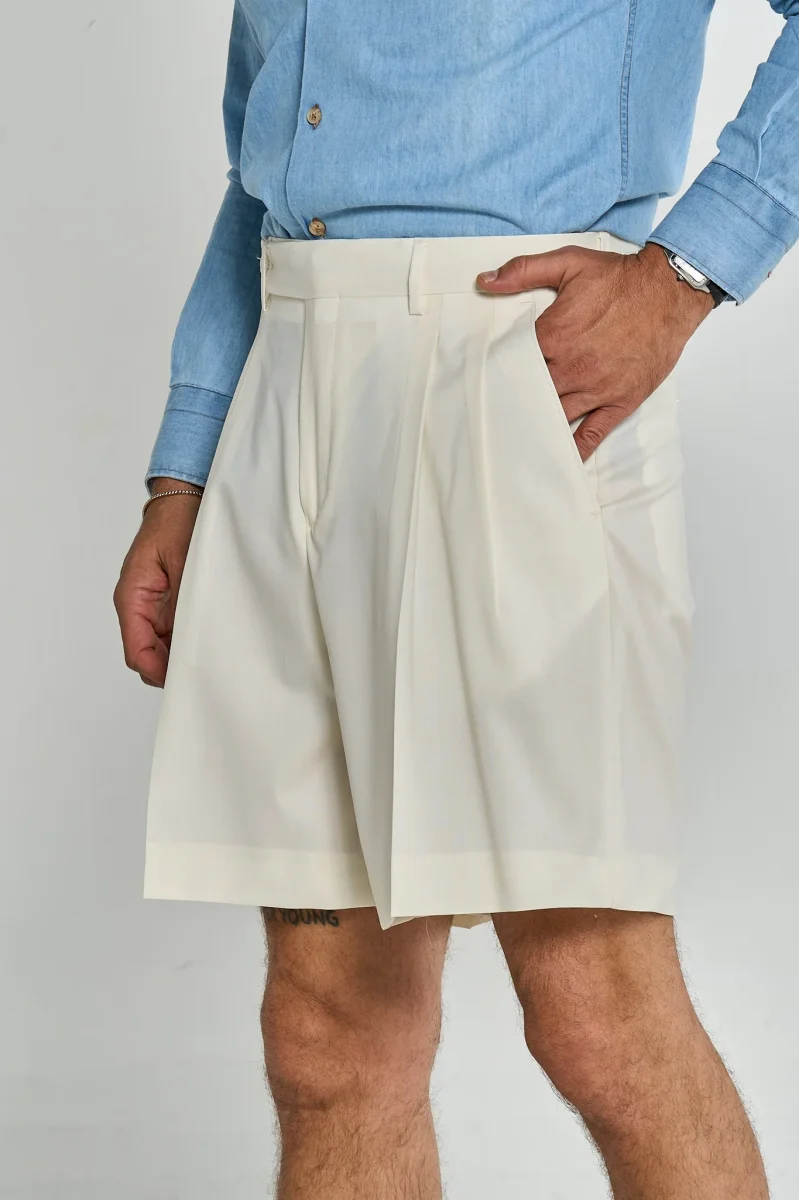 Questo bermuda è un capo elegante e raffinato, ideale per la stagione estiva. Presenta una struttura sartoriale con pieghe frontali che donano volume e movimento, una chiusura con bottone laterale e passanti per cintura. Il taglio è ampio e comodo, ma mantiene un aspetto sofisticato. Perfetto da abbinare a una camicia o una polo per un look smart casual.