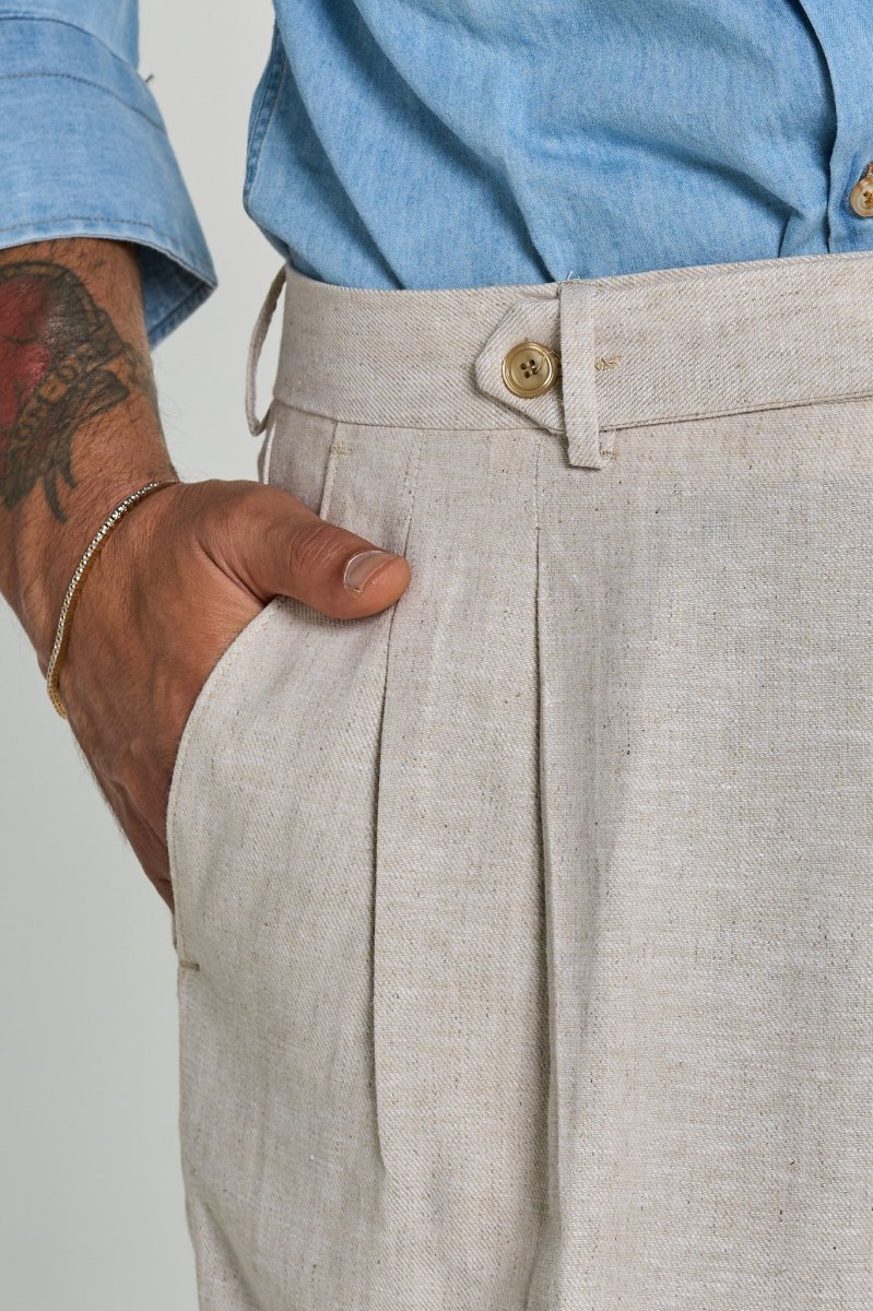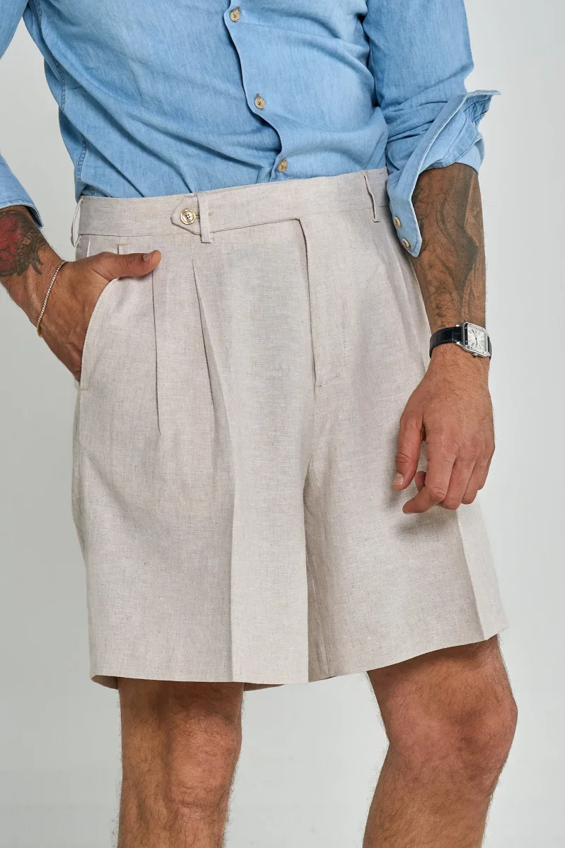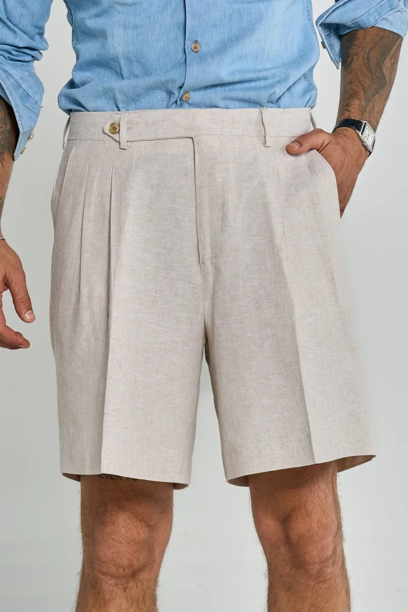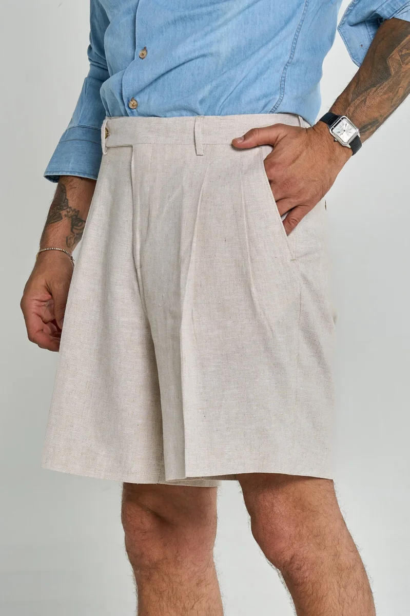 Questo bermuda è un capo elegante e raffinato, ideale per la stagione estiva. Presenta una struttura sartoriale con pieghe frontali che donano volume e movimento, una chiusura con bottone laterale e passanti per cintura. Il taglio è ampio e comodo, ma mantiene un aspetto sofisticato. Perfetto da abbinare a una camicia o una polo per un look smart casual.
