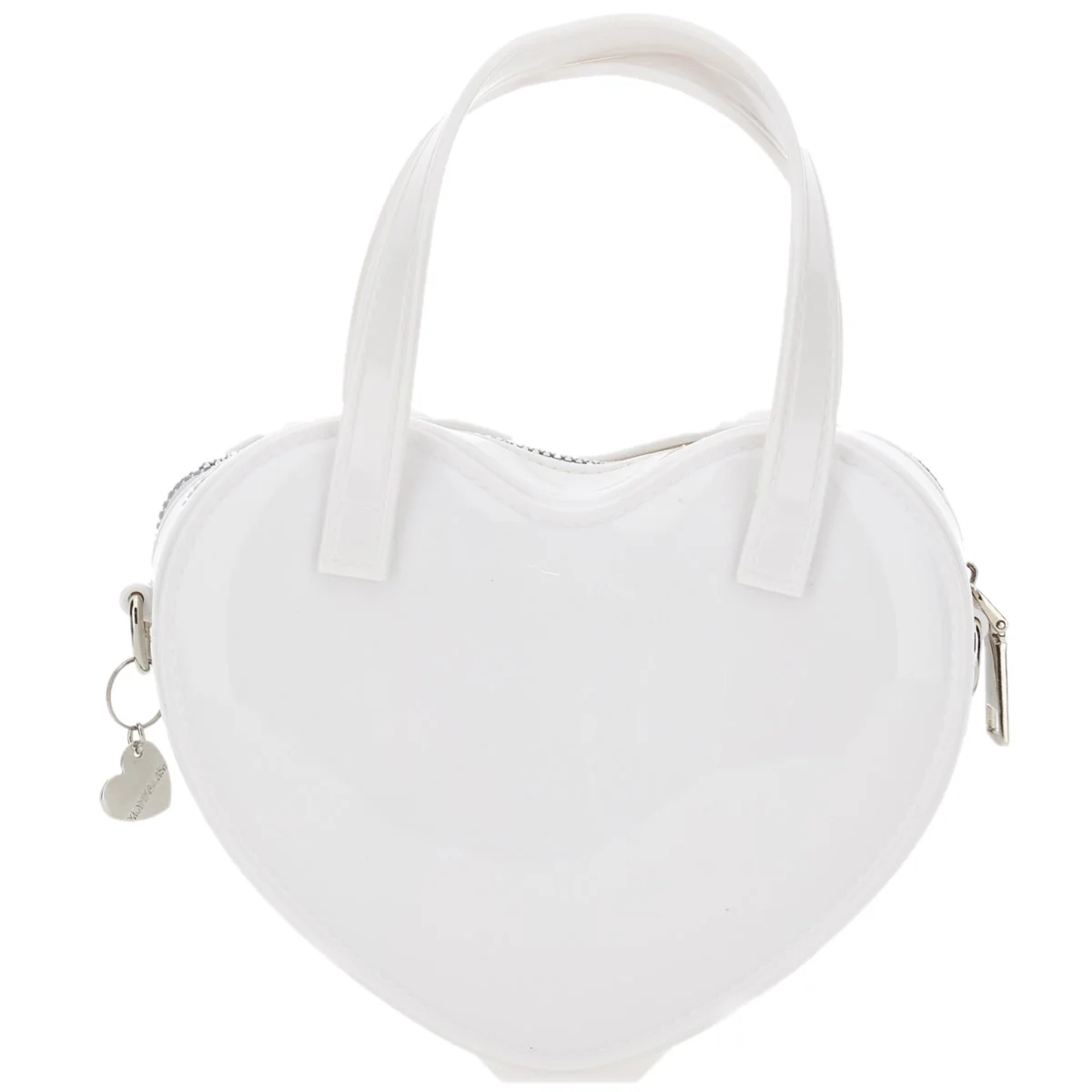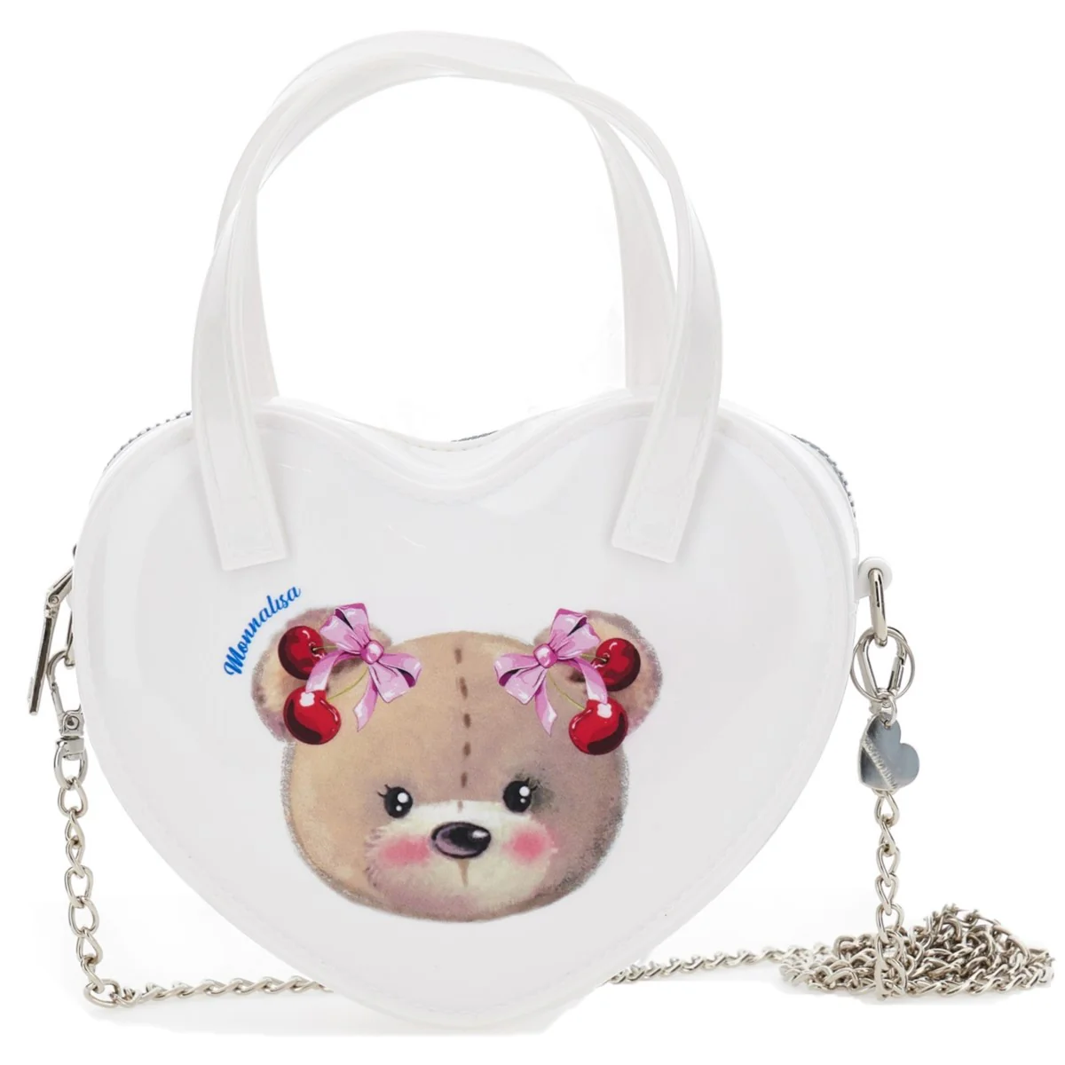 Borsa MONNALISA in vernice con stampa orsetto e logo stampato, manici applicati, chiusura con zip, ciondolo cuore logato in metallo applicato, tracolla in metallo removibile.