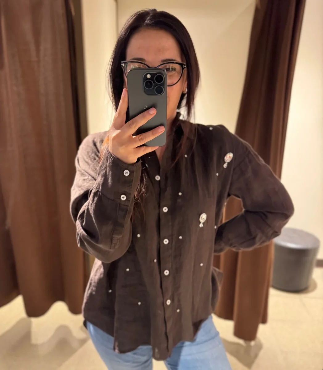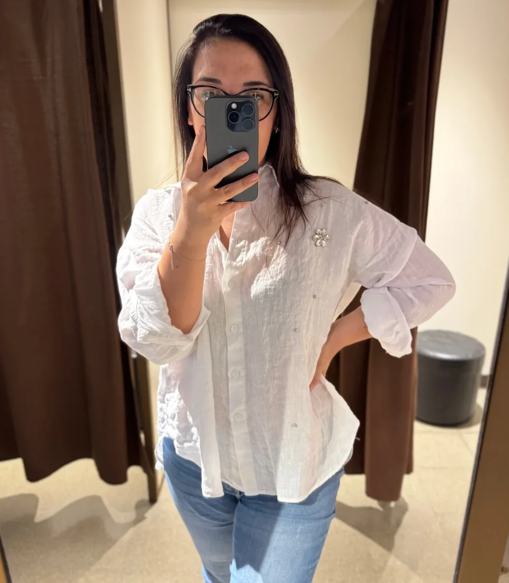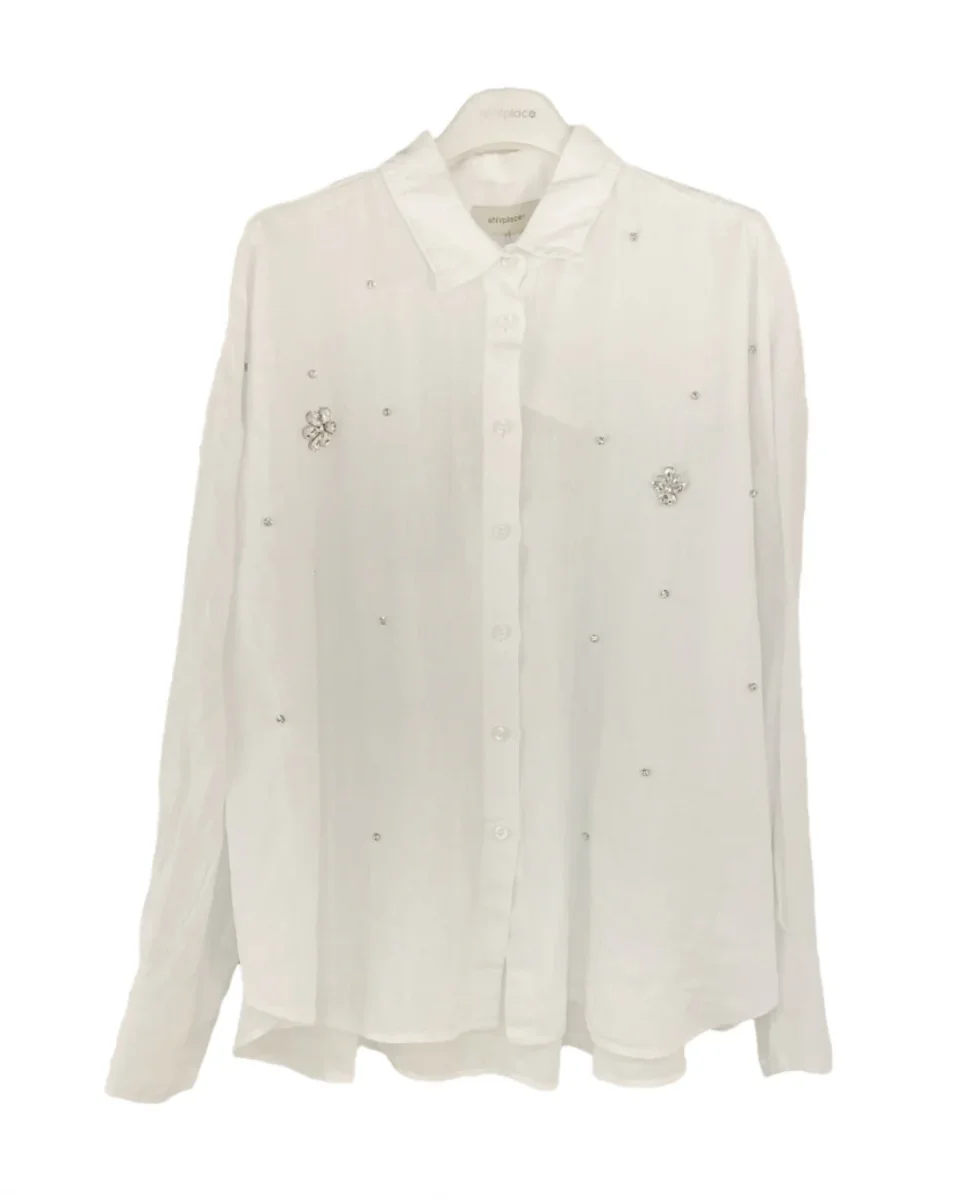 Camicia over in tessuto 100% lino. Colletto piccolo, spalla raglan. Maniche lunghe ampie. Applicazioni con macro pietre sul davanti. Vestibilità ampia.