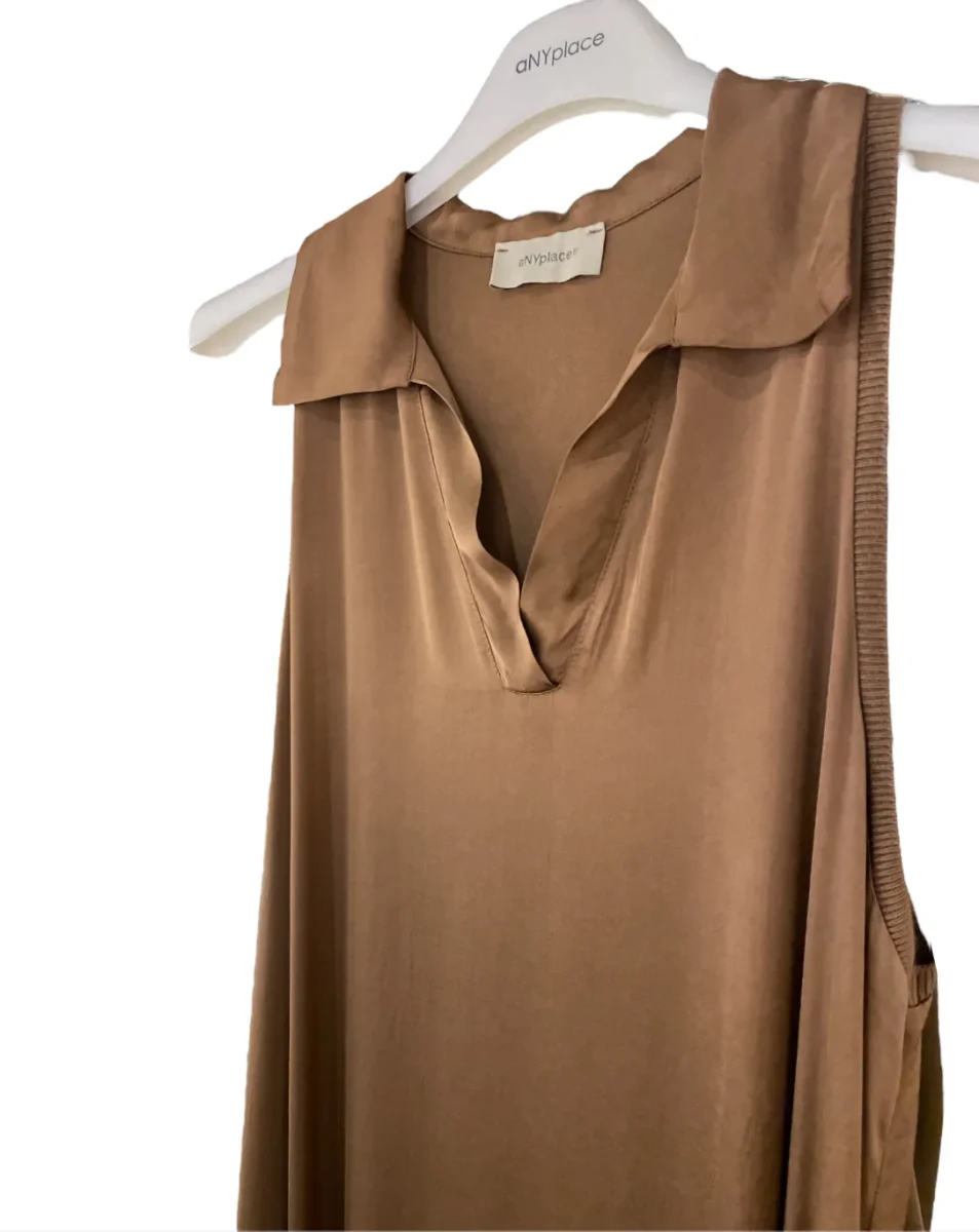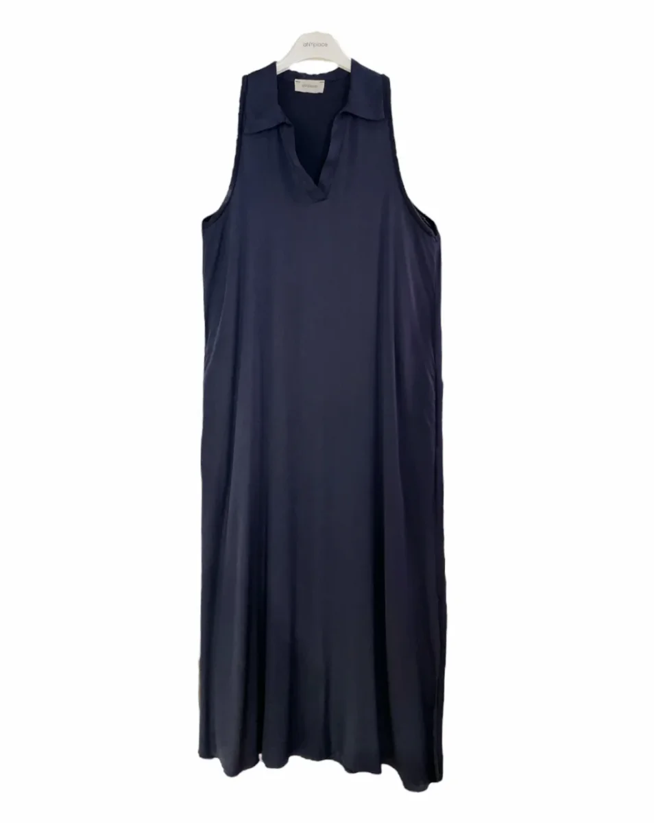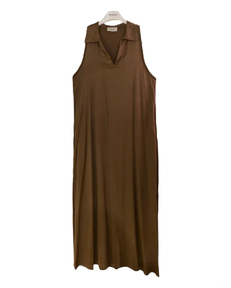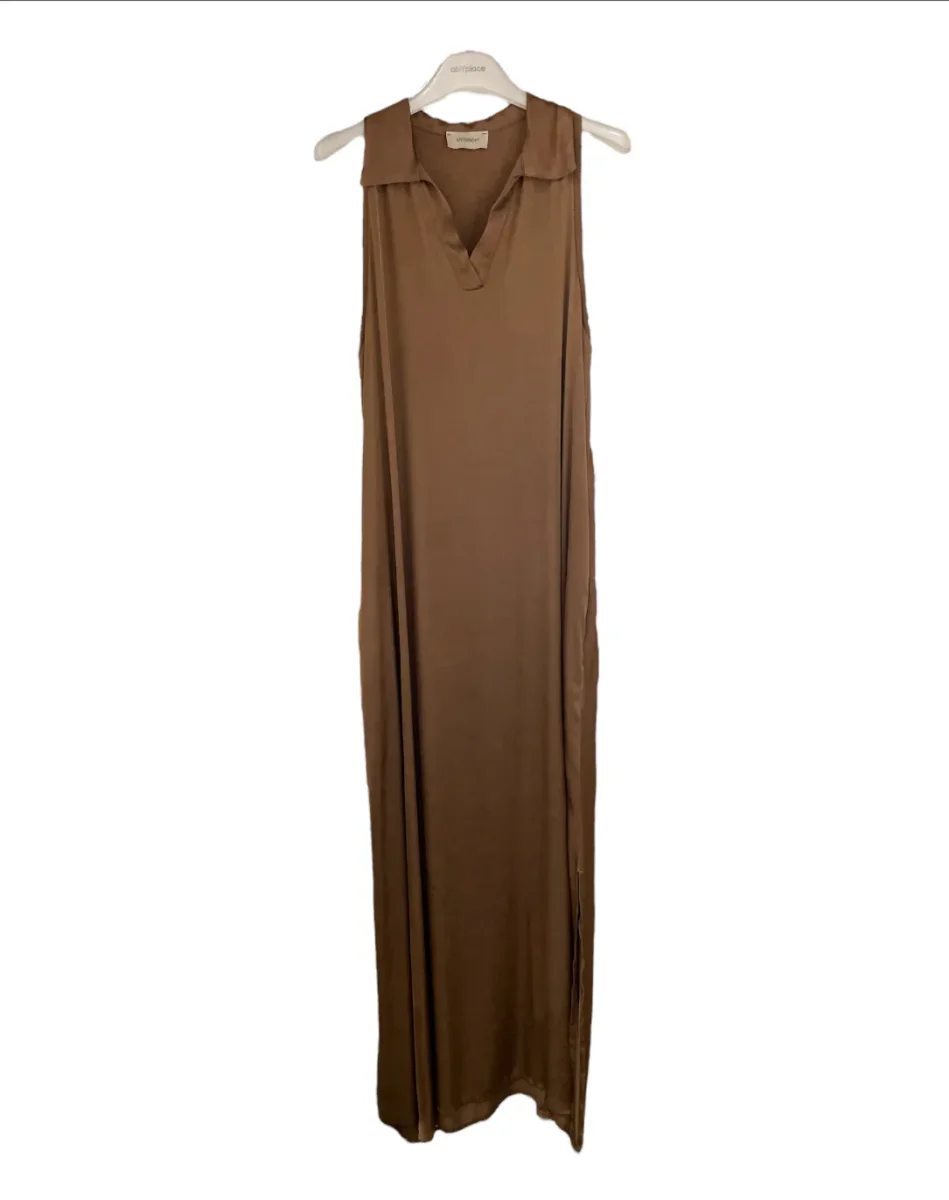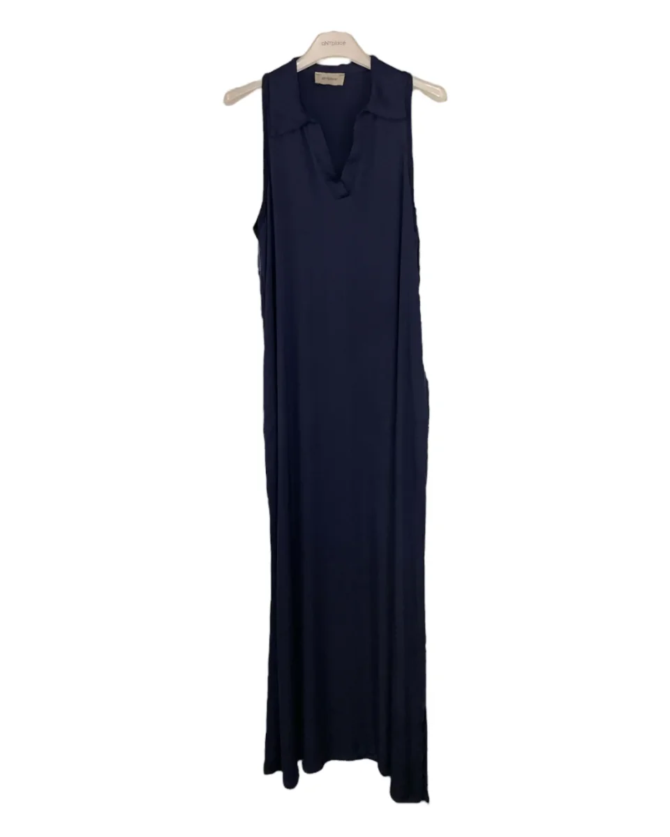 Vestito lungo in tessuto ultra leggero 100% viscosa. Colletto modello polo in tessuto lavorato a costine, scollo a punta. Lunghezza al tallone, spacco laterale. Vestibilità comoda.