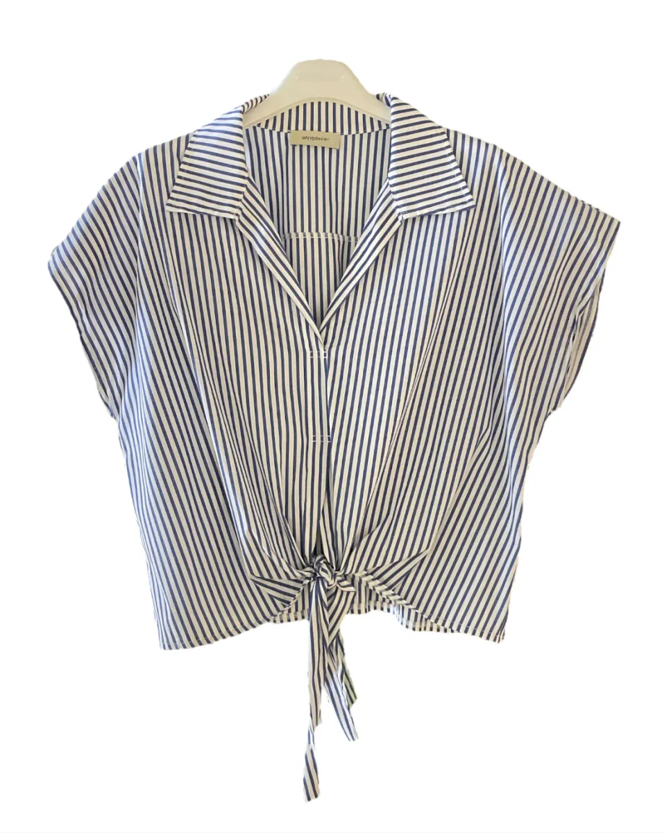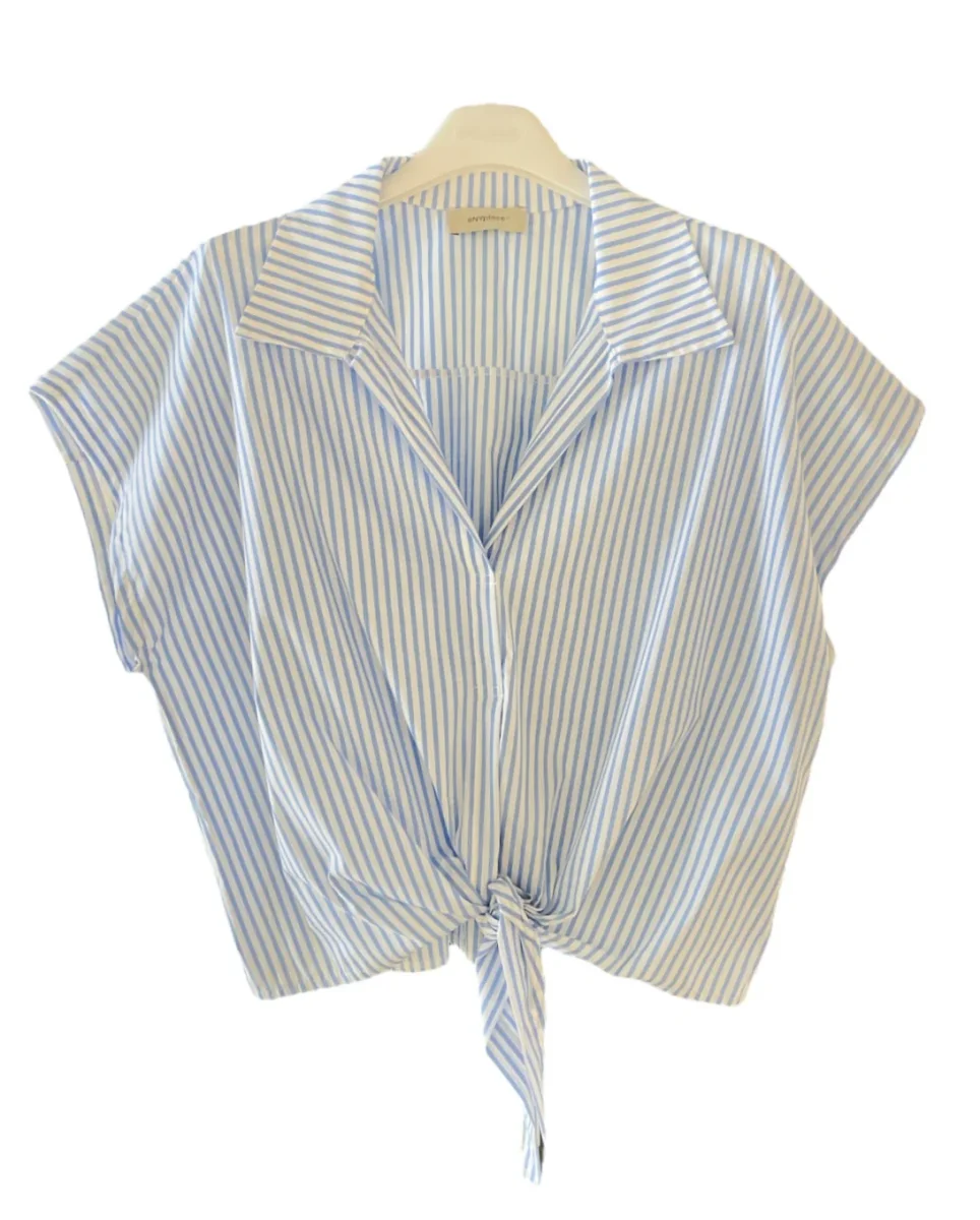 Camicia crop in tessuto misto cotone. Colletto piccolo, scollo a punta modello casacca. Maniche corte con spalla raglan. Fondo con nodo, vestibilità regolare. Composizione tessuto 60% cotone 37% poliammide 3% elastan.