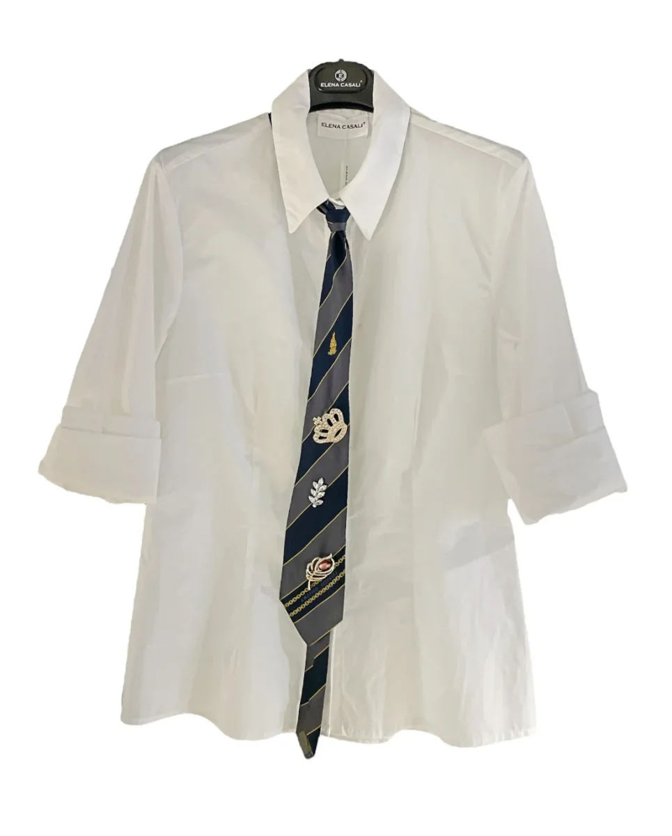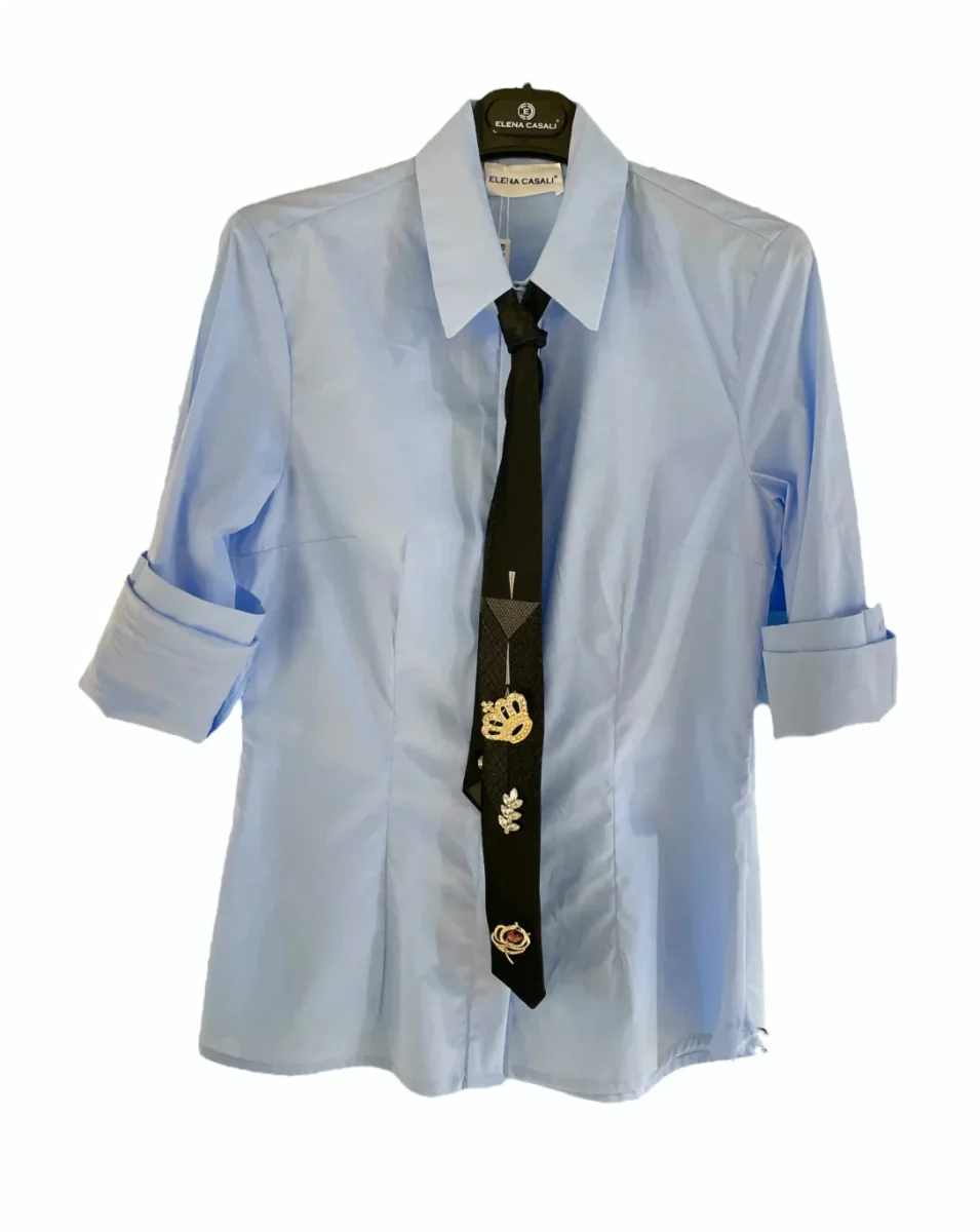 Camicia slim fit in tessuto misto cotone. Riprese sul davanti e dietro. Maniche lunghe. Il cravattino in foto è indicativo e cambia in modo casuale. Vestibilità aderente.